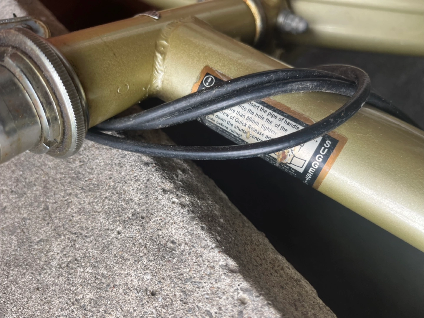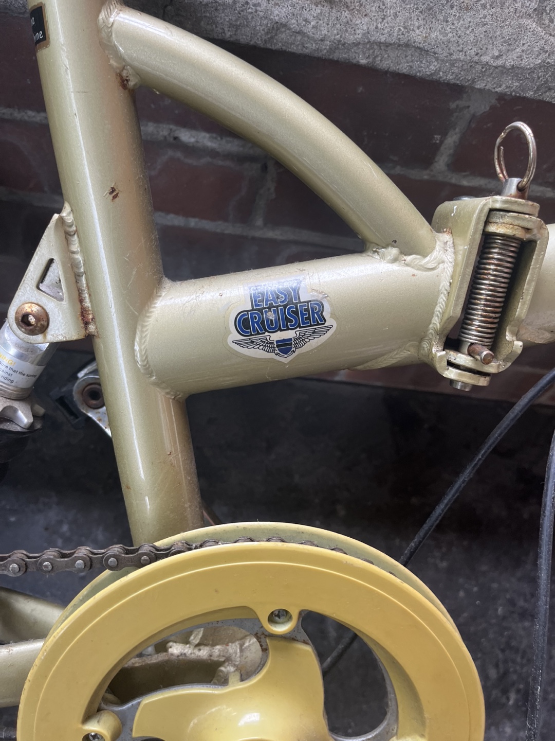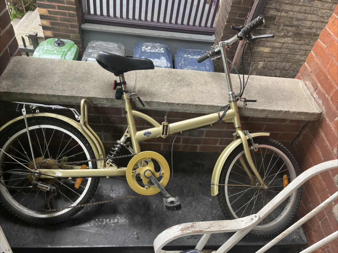 Here's a folding bike with a gold frame. Handlebars present. Features a rear rack. The bike has a black seat. A great choice for leisurely rides through the city. Adjustable bike seat. Also good for uber eats and door dash.