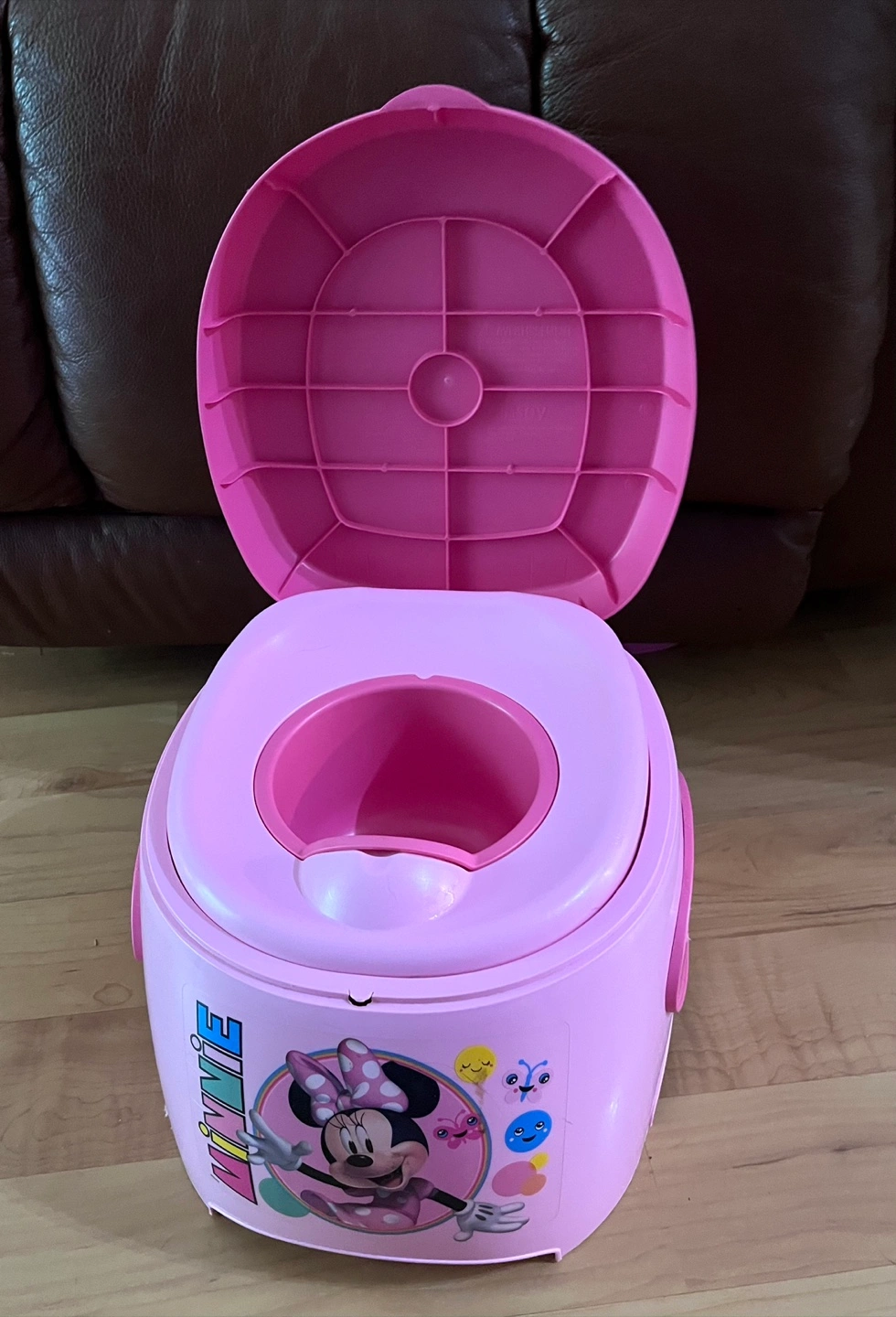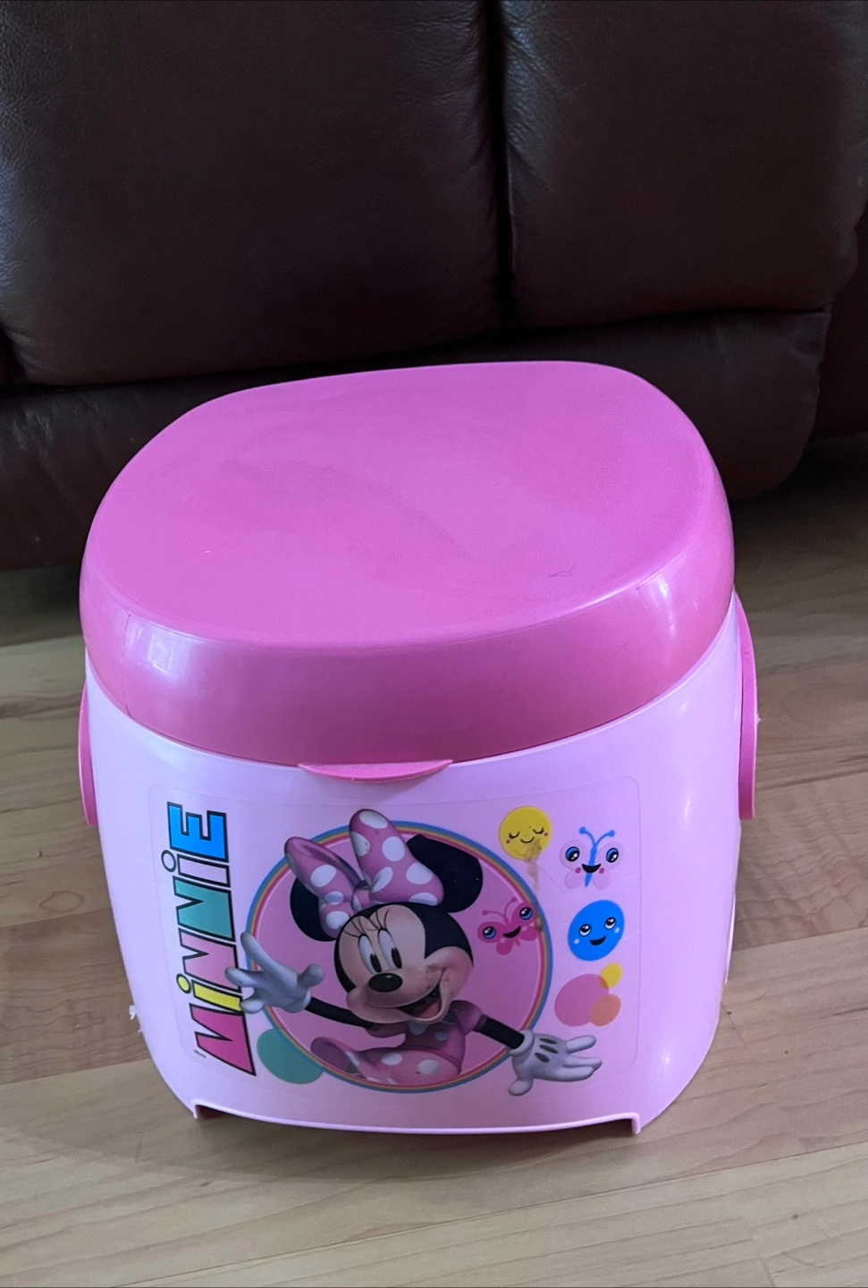 31Pink potty chair. Features Minnie Mouse. The lid opens and closes. A fantastic aid to toilet training. Can be used as a stepping stool when closed