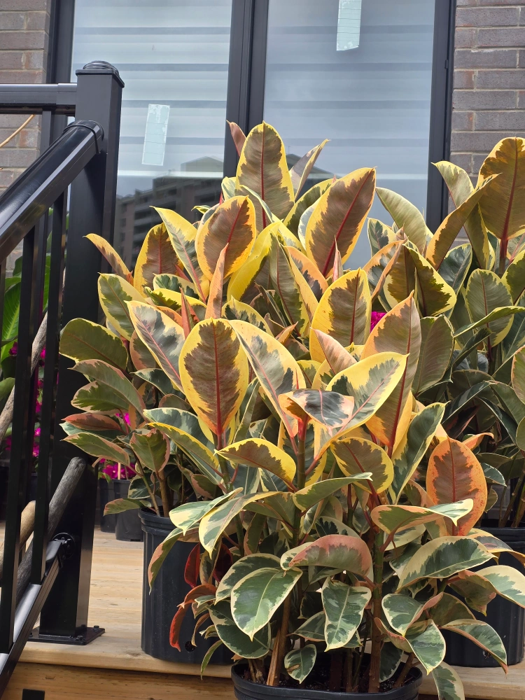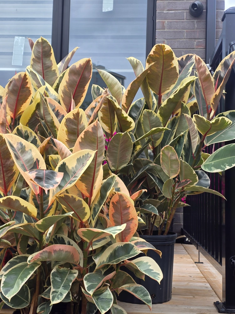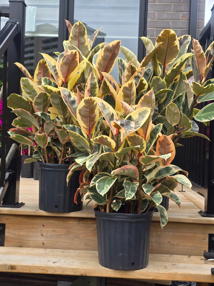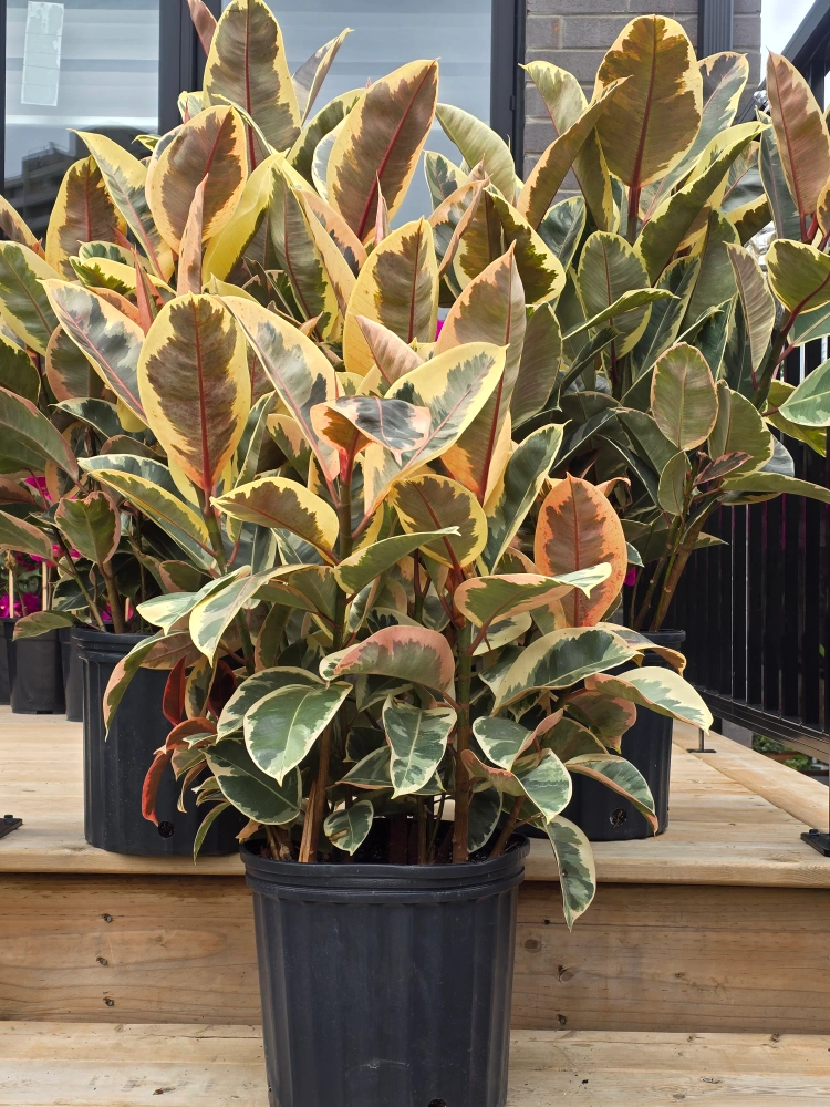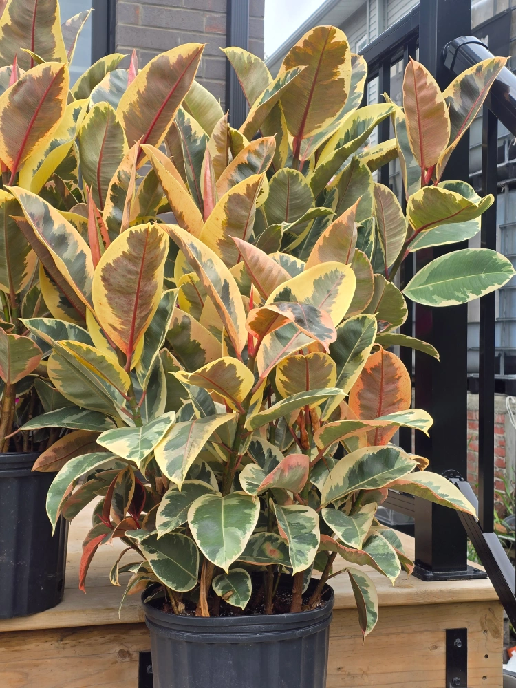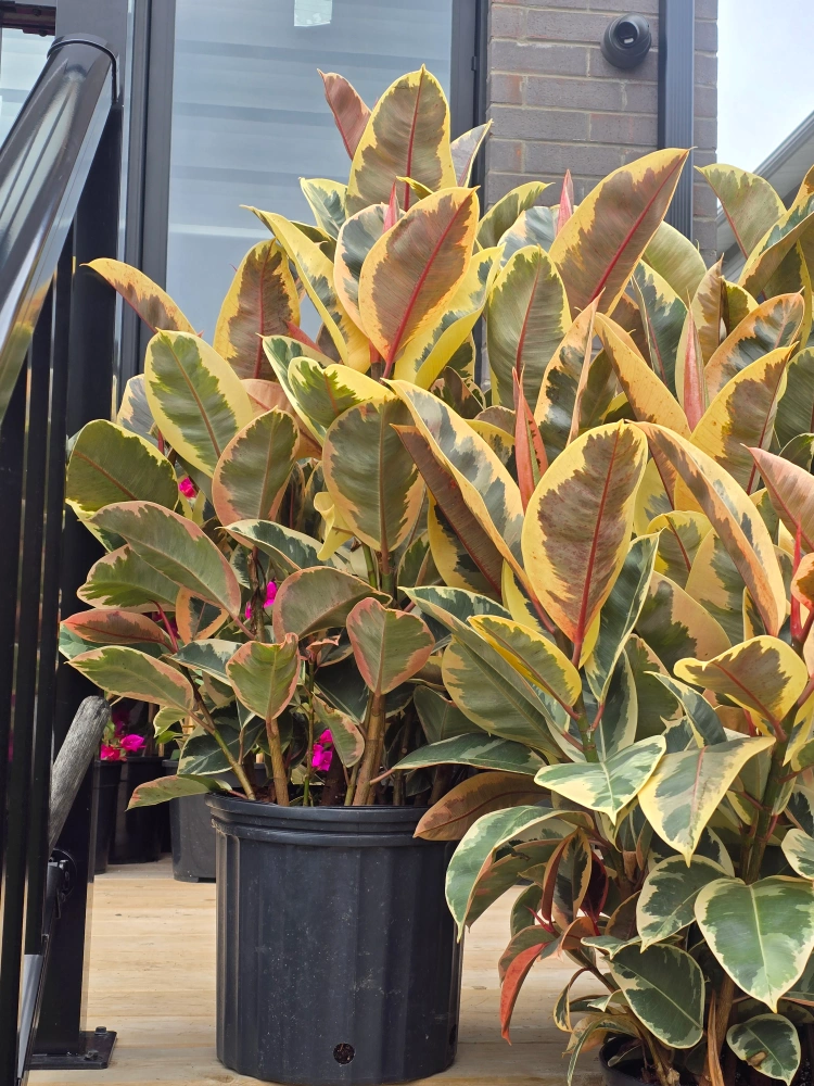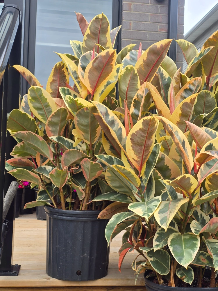 A lovely, colourful plant. Features big, variegated leaves. Planted in a black container. Perfect for adding a touch of nature to your space.