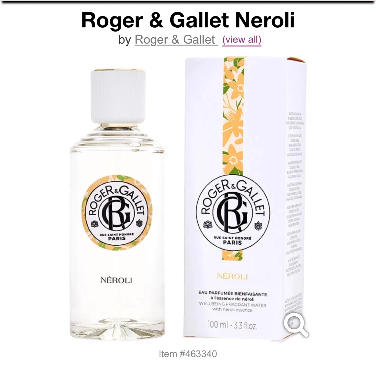 A perfume bottle and its box are displayed. The perfume appears transparent. The box is white with gold and orange accents. The scent is a wellbeing fragrant water. Consider using this perfume to soothe your mind and body.