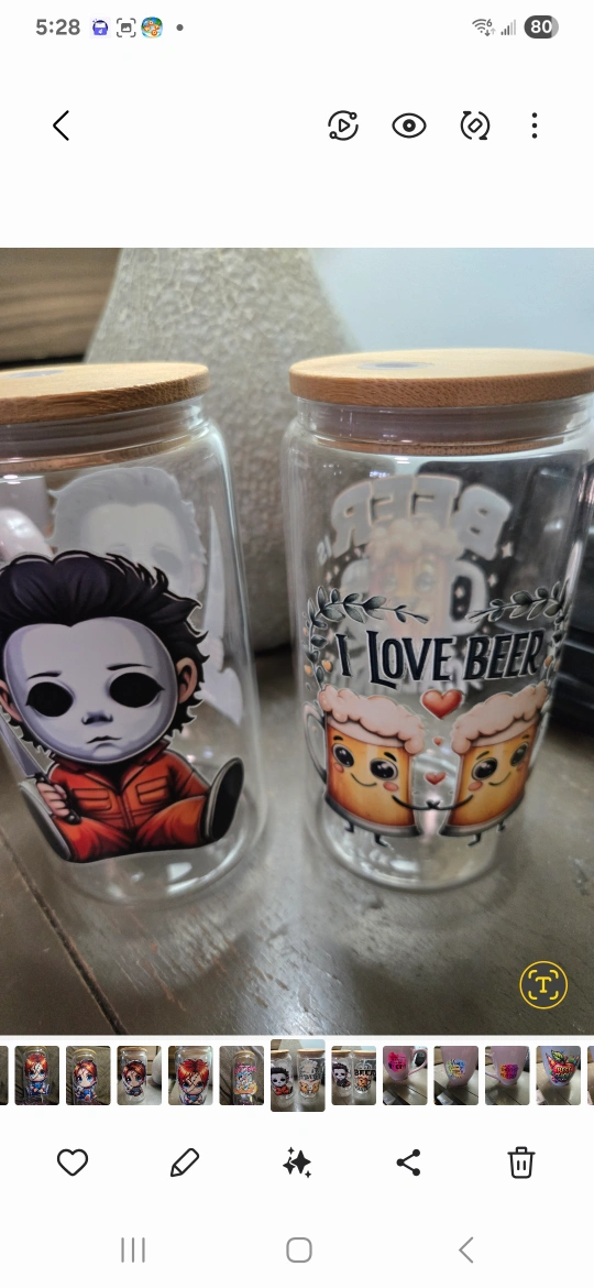 These glasses have some cute designs on them. They appear to be clear glass and have wooden lids. They are perfect for enjoying your favorite drinks.
