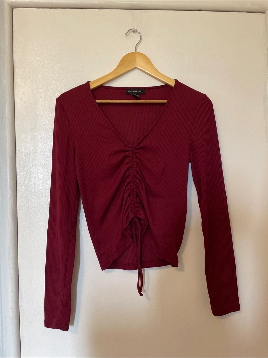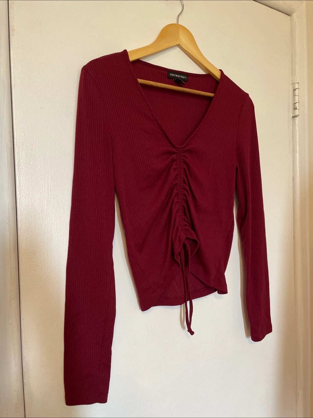 Beautiful deep red colour with long sleeves. A ruched detail is down the center, and a v-neck line. Great Condition.