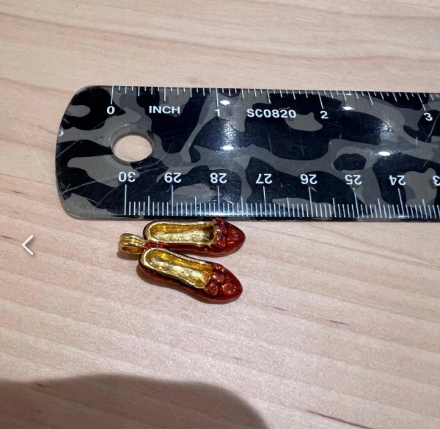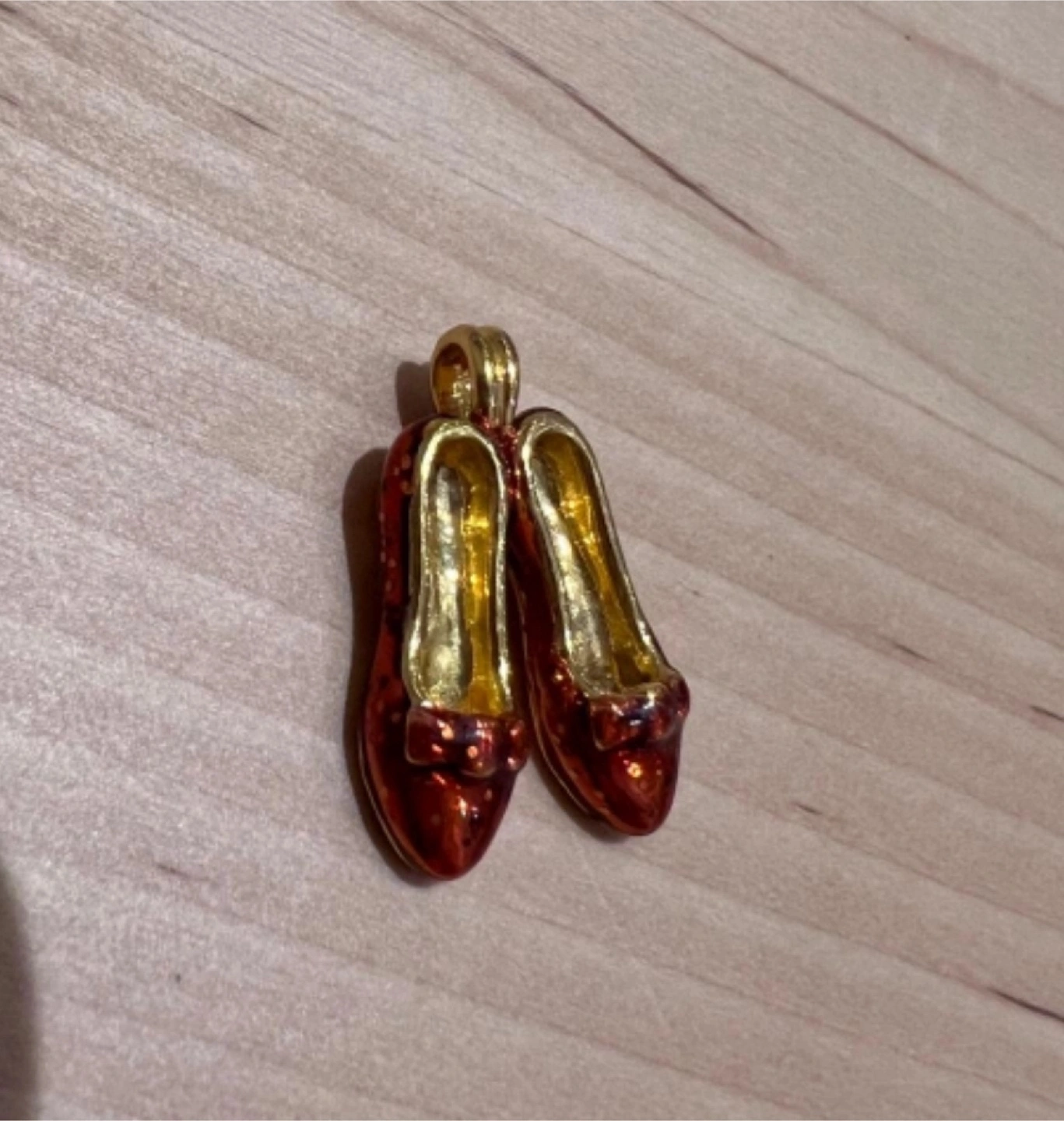 A lovely, miniature ruby red slipper charm pendant. Detailed with gold accents. A whimsical accessory that would bring a smile to your face.