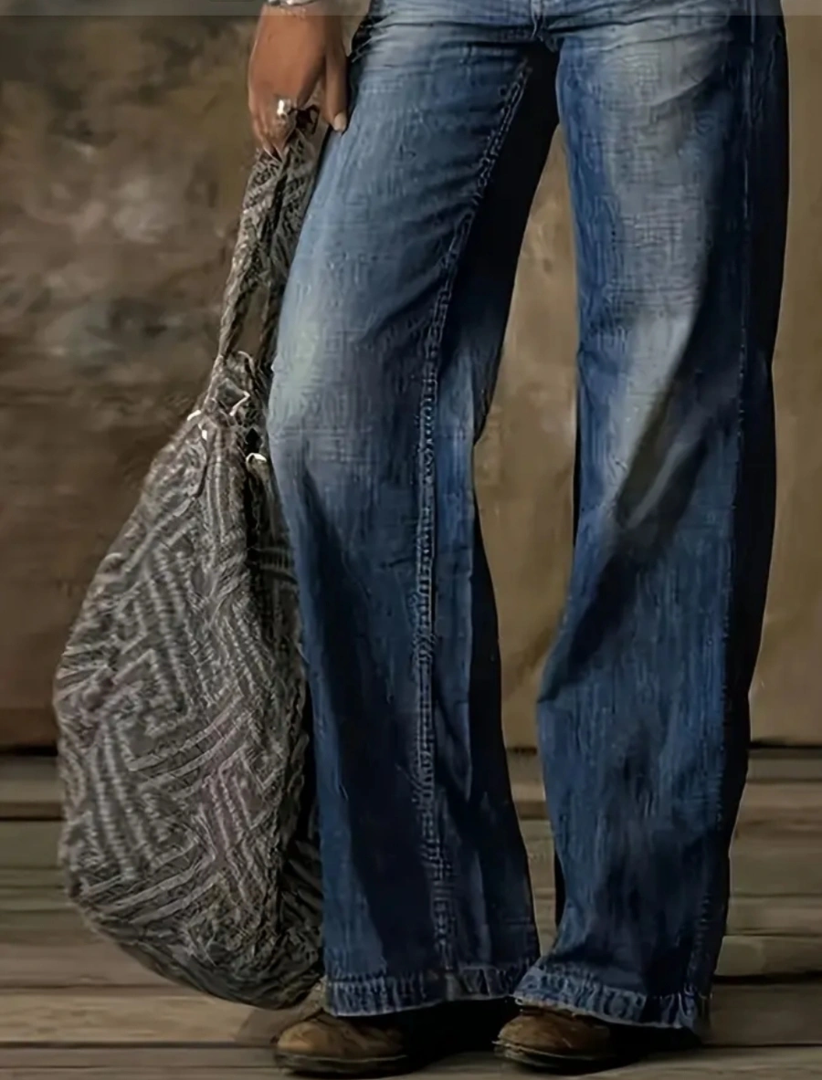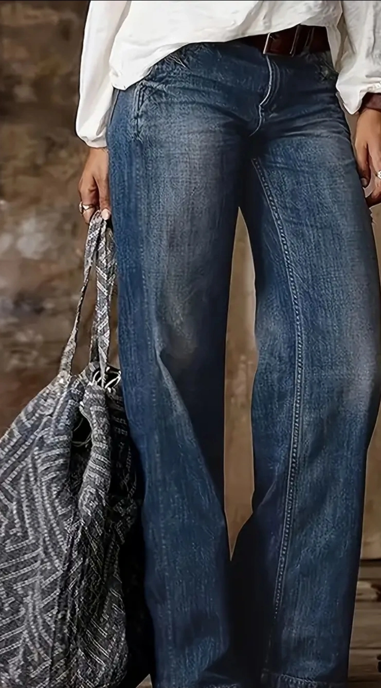 High Waiste Wide-leg denim jeans. Blue in colour. Features pockets. .Diagonal Pockets and Button Design, Wide Leg, Medium Stretch, Solid Color, Washed Detail