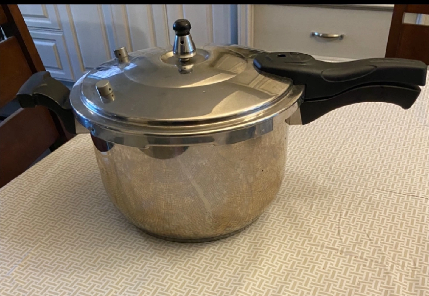 Pressure cooker made of stainless steel. Includes lid. Inside, there is a metal insert along with an extra rubber gasket. 8L size $45 firm.