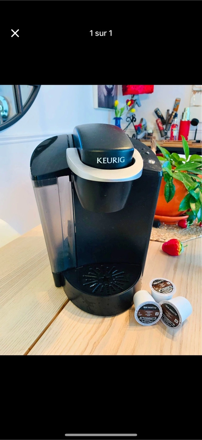 A Keurig coffee machine with a water reservoir. Also includes a drip tray and a spot for the K-Cups. Brewing a warm beverage can be a perfect way to start your day.