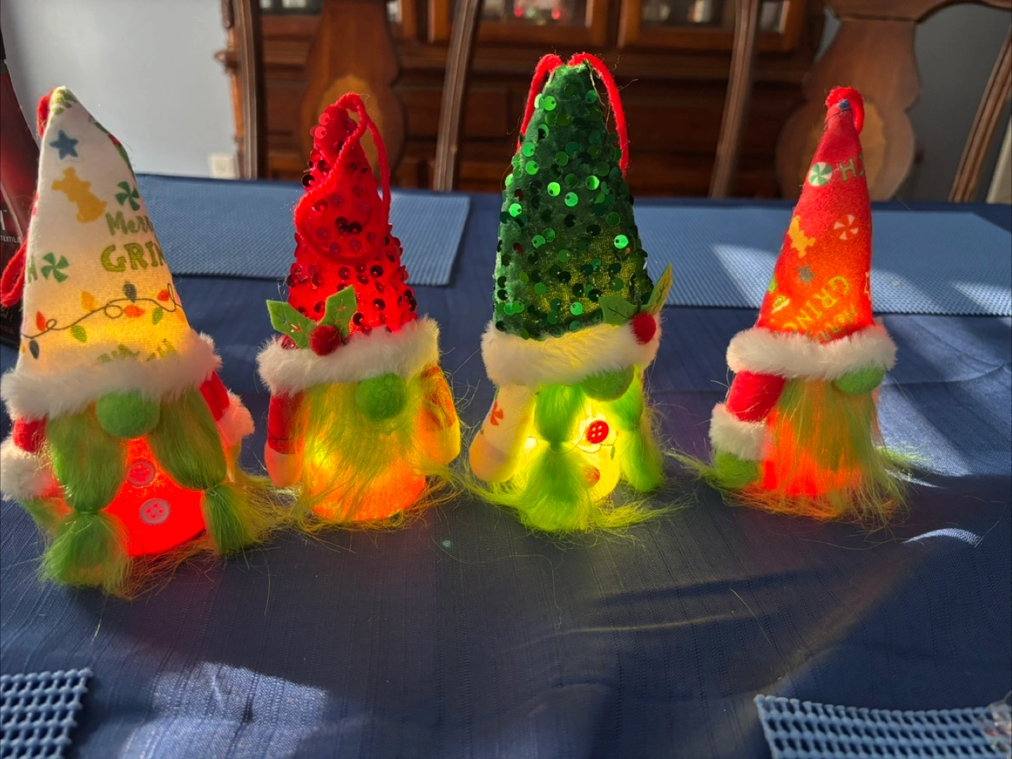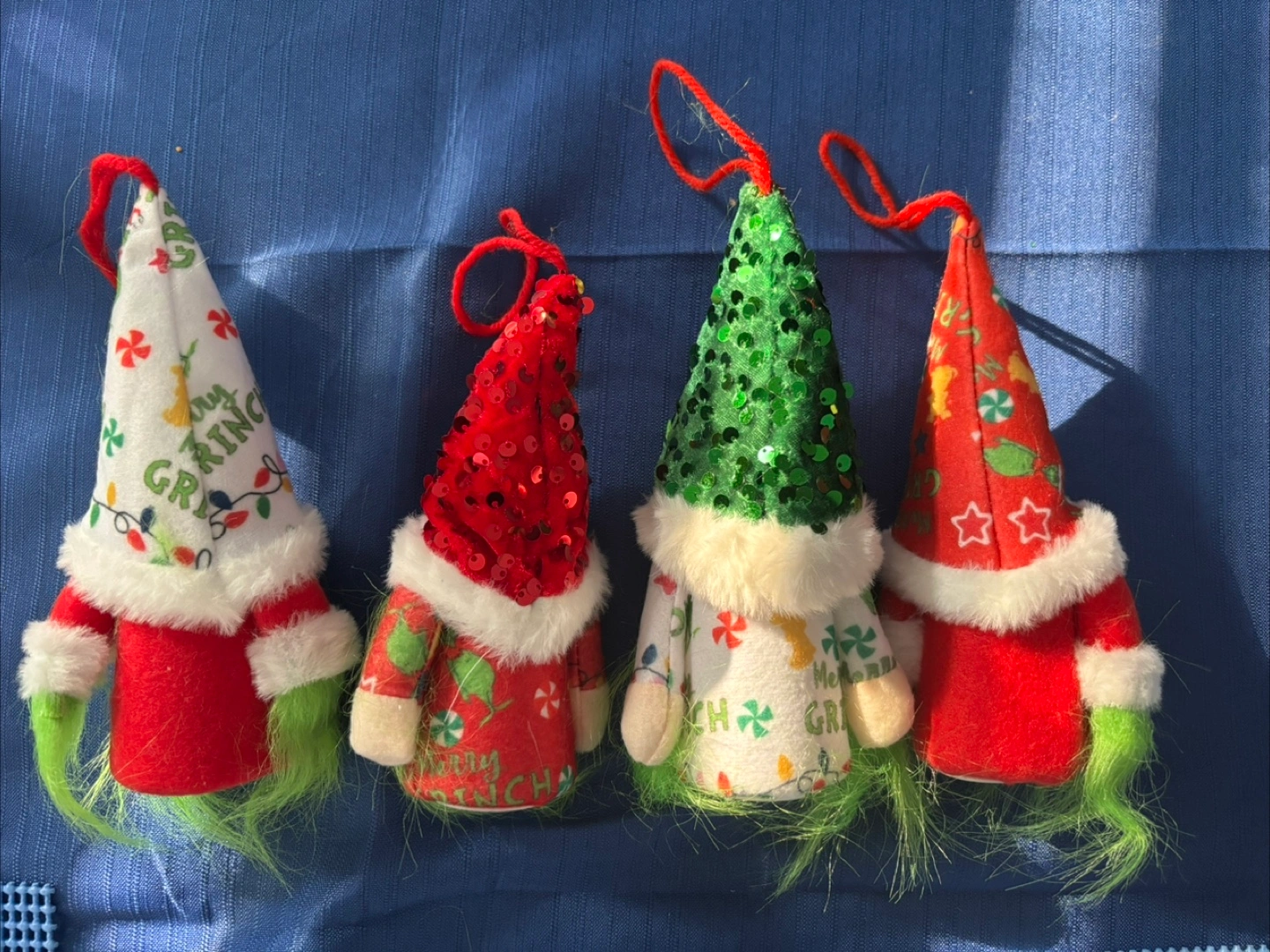 286Set of Grinch-themed gnome ornaments. Each one has a different decorated hat. They would make a great addition to your Christmas tree, bringing a touch of whimsical charm.