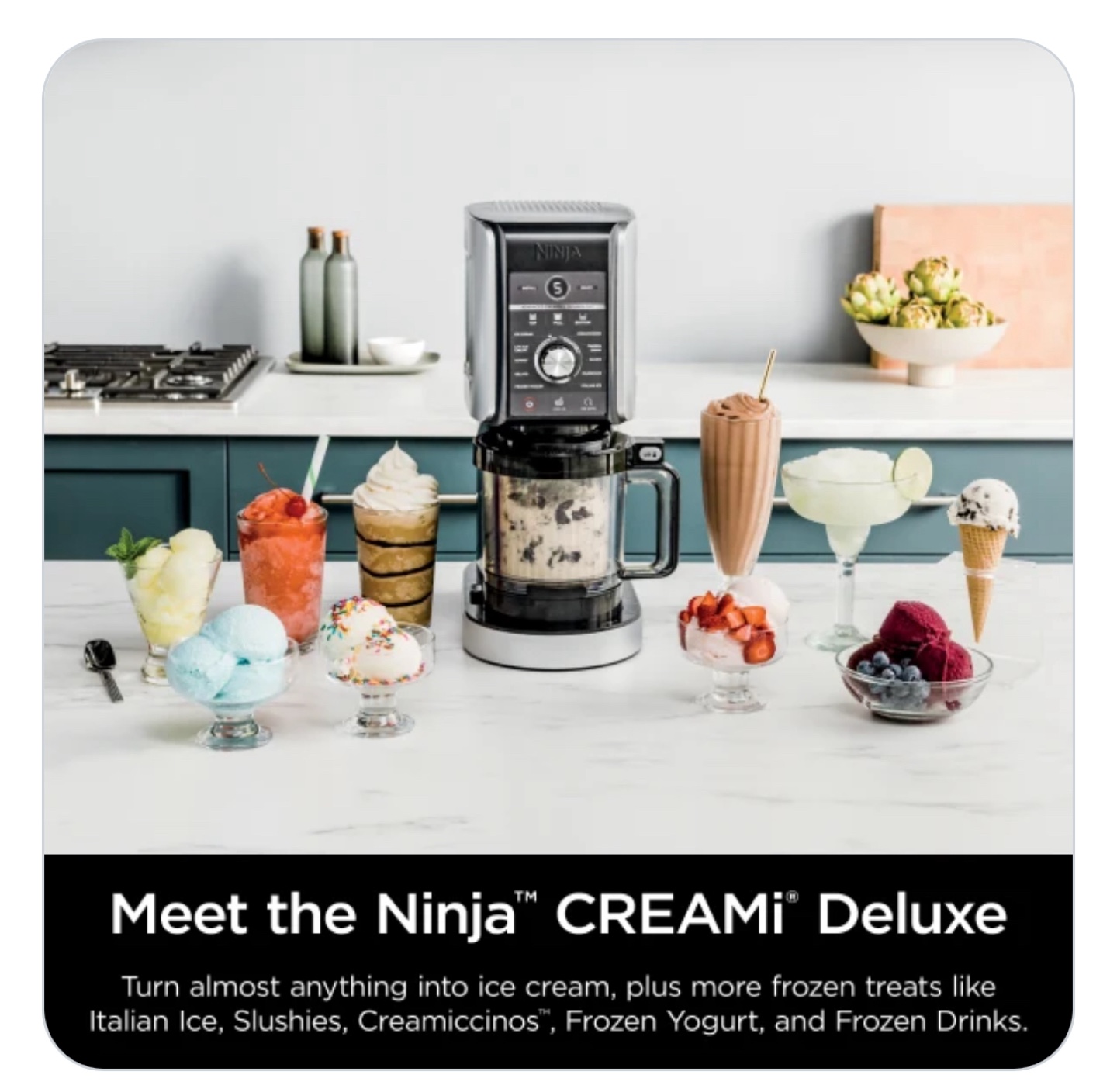 With the Ninja® CREAMi® XL Deluxe, make classic CREAMi® treats like ice cream, sorbet, gelato, and mix-in masterpieces. And now, make CREAMi® treats like Italian ice, Slushi, Creamiccino™, frozen yogurt, and frozen drinks right at home.