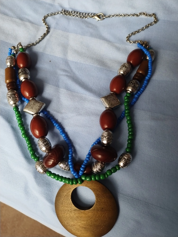 A beautiful necklace. Features several strands with beads. Has silver-toned accents. Includes a large wooden pendant. This necklace would be perfect to accessorize any outfit.