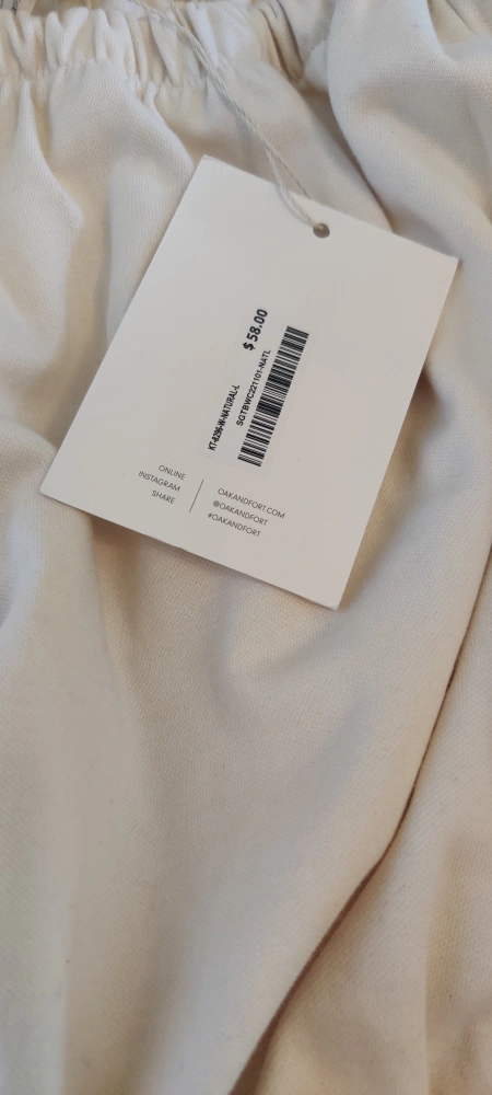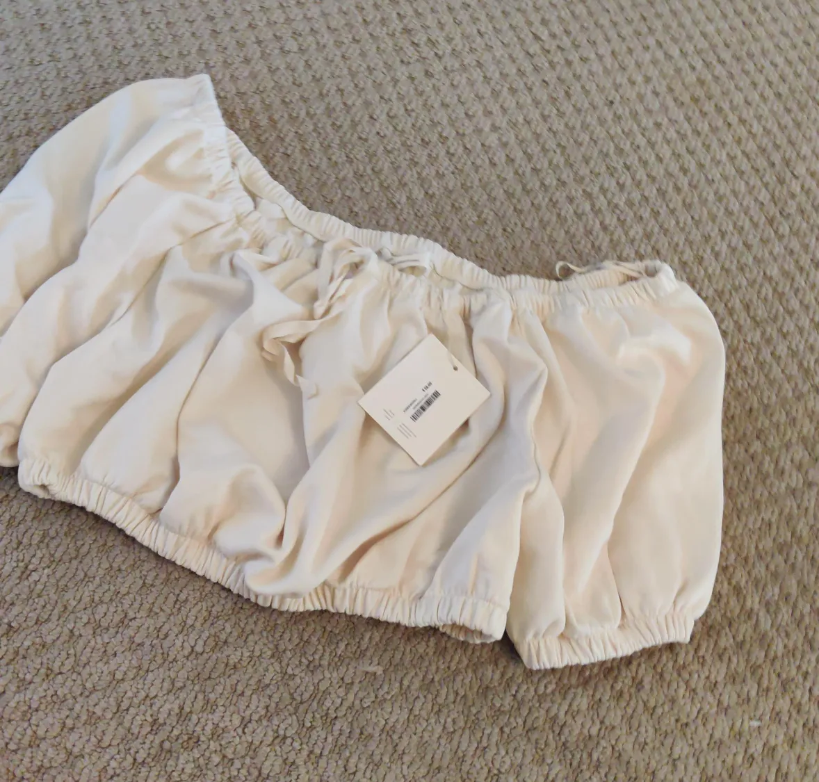 The item is cream-coloured. An off-the-shoulder top, with a puffy sleeve. It's new with tags. This top would be amazing for a picnic.