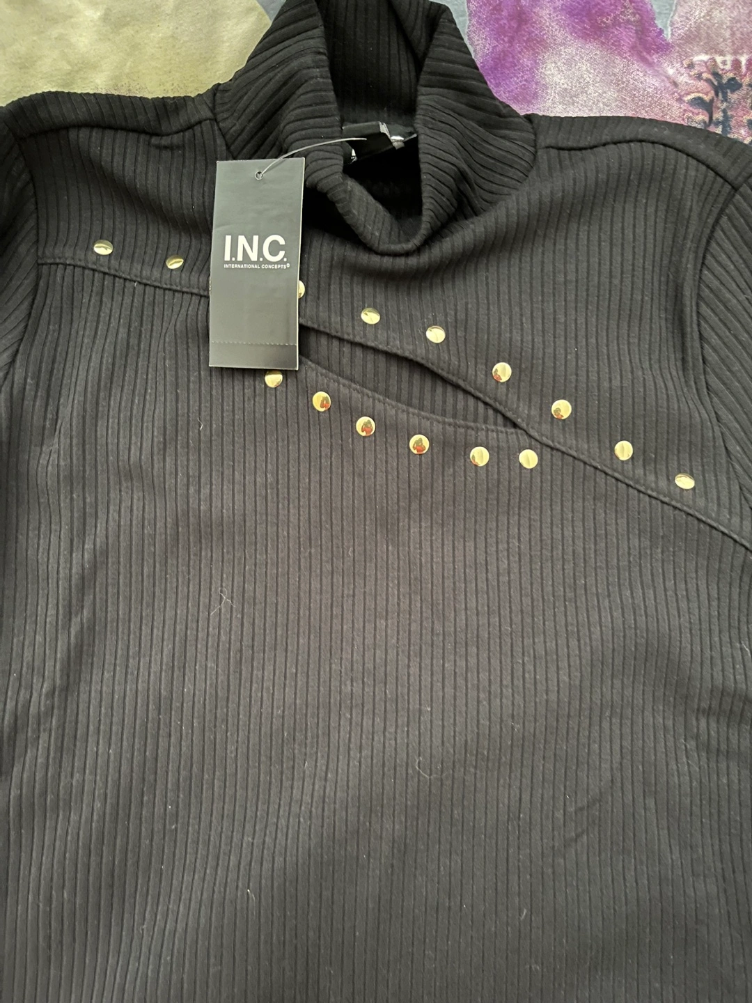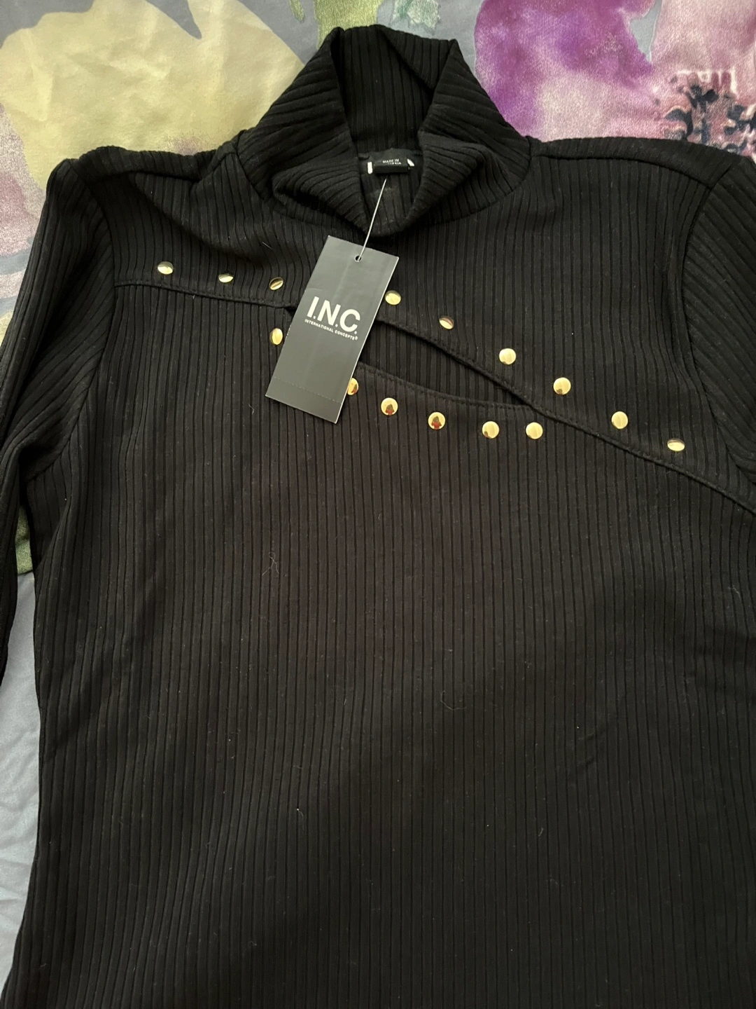A lovely black sweater. Features a turtleneck and long sleeves. Decorated with gold studs. A perfect wardrobe piece to make you feel cozy.