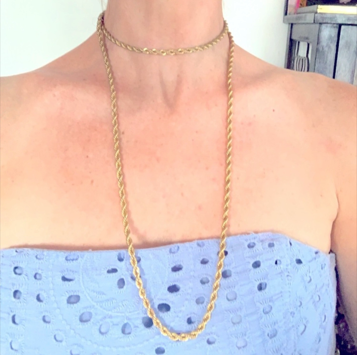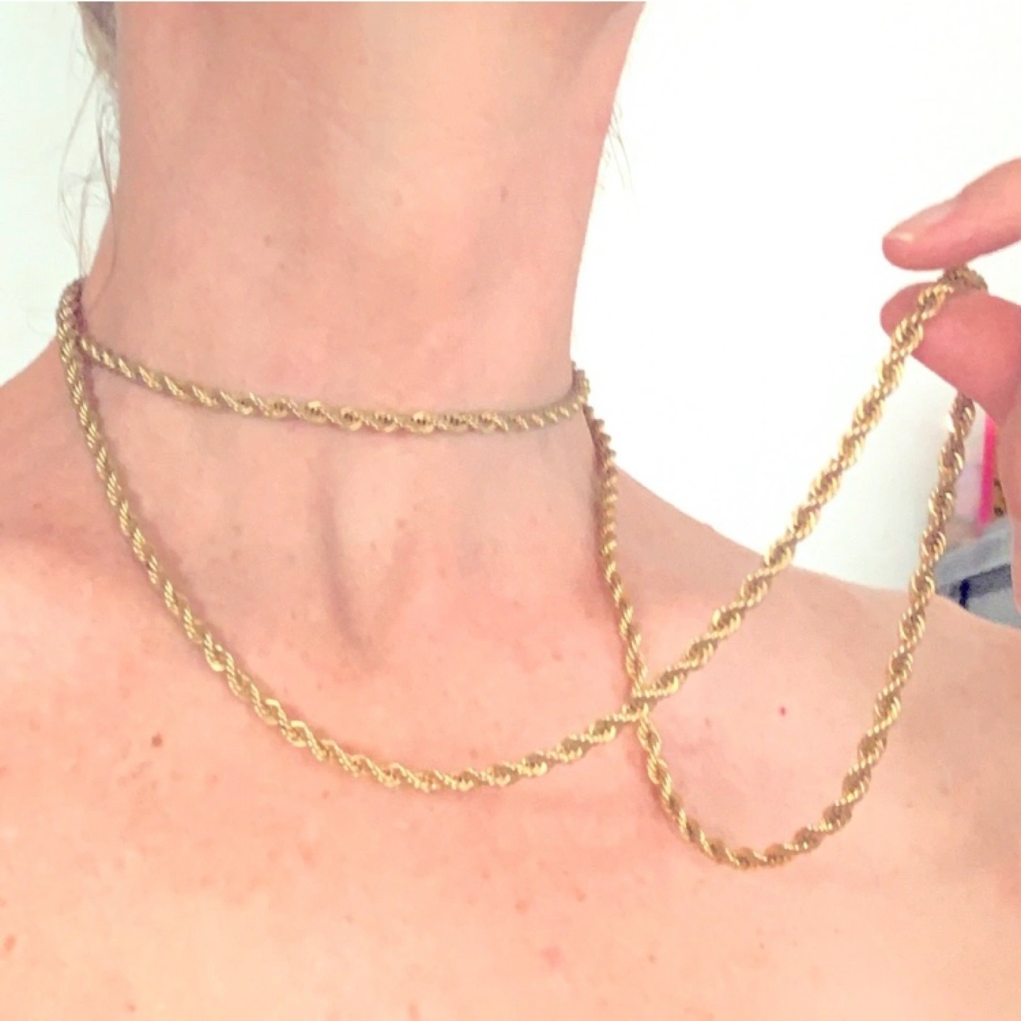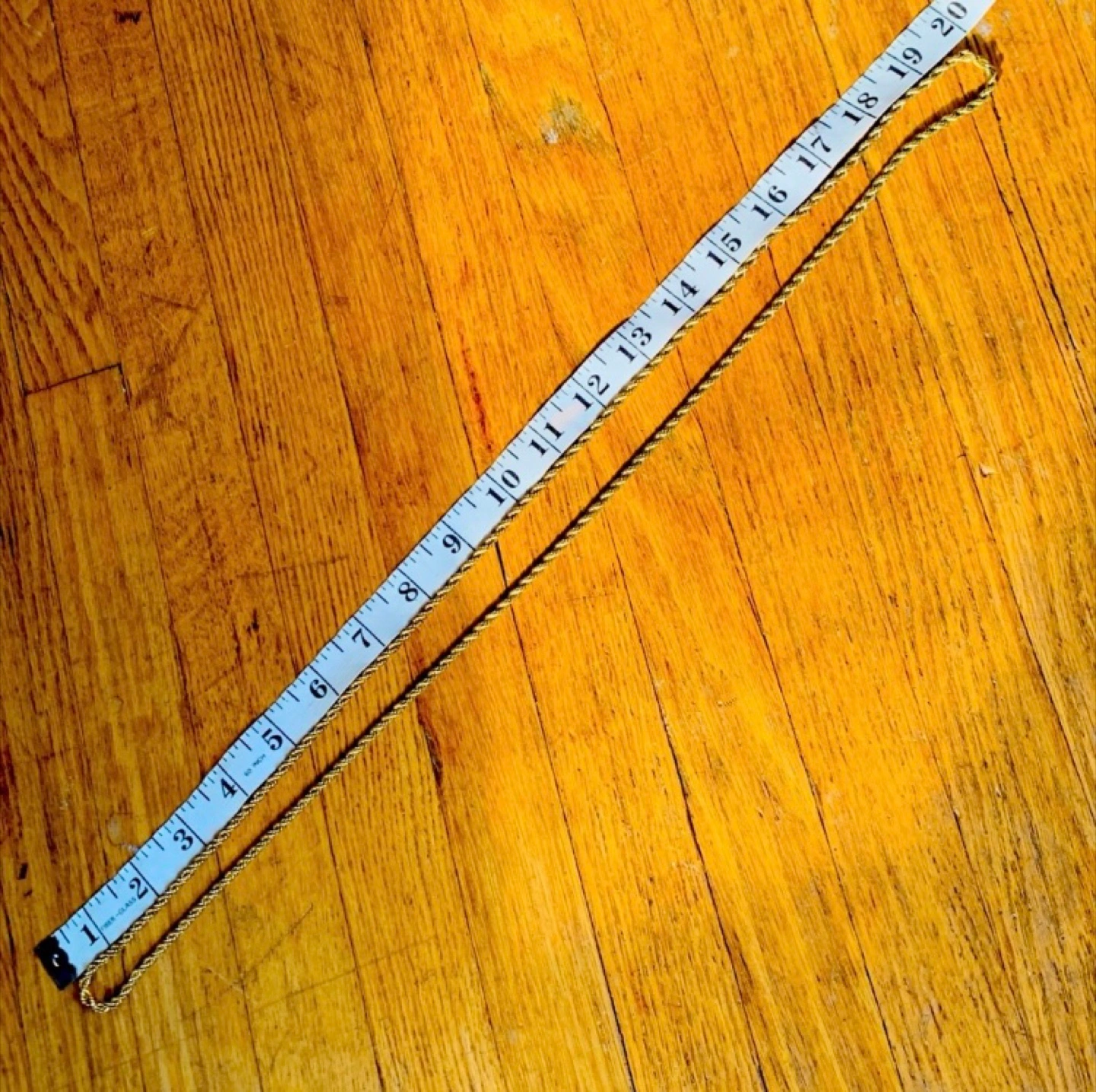 20 inches long. 43.48 Grams. The gold on this is thick. When this came to me I actually thought it was pure gold, but had it tested and it tested as gold filled, heavily filled with gold. Excellent vintage condition. Circa Estate 1970’s. Very glowy buttery gold. No clasp, wear it long or wrap it around💛The gold on this is in excellent shape, especially considering it is from the 1970s that goes to show how much gold there is in it. There is only one small segment that shows its age, likely where a pendant was hung over a long period of time. GORGEOUS piece!!
