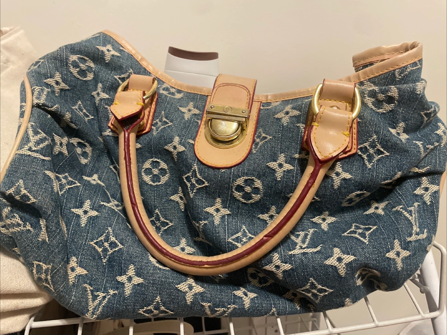 The denim handbag has a beautiful print. It has handles with leather trim. The hardware is gold-toned. Consider the bag as your everyday companion, to add a touch of luxury to your days. slightly worn from use but perfect for those hunting for fashion accessories!! unsure if real it was gifted to me