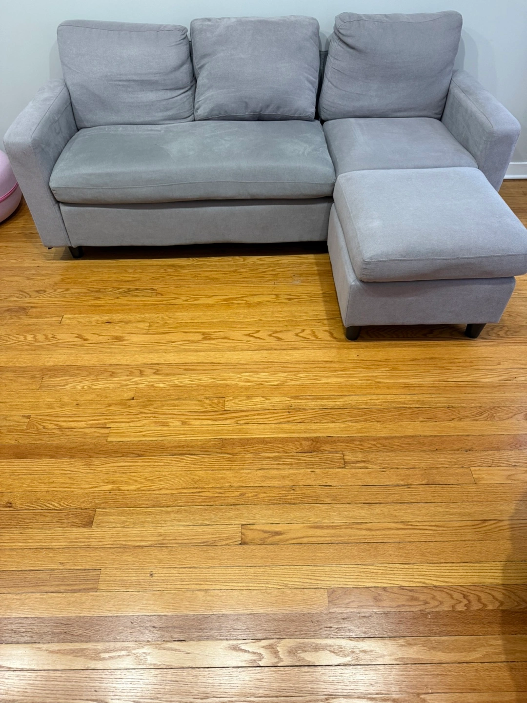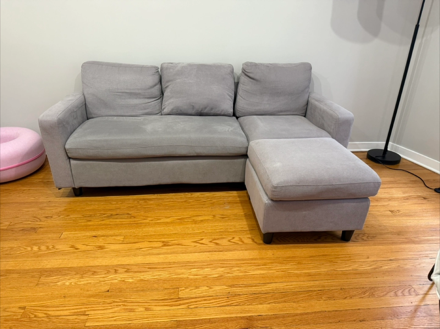 MUST GO BY JUNE 18! Up 1.5 flights of stairs. Willing to negotiate. This lightweight spacious sofa and ottoman set is perfect for lounging after a long day. It has a gray fabric upholstery. It has a three-cushion sofa with an attached chaise. The ottoman is also included.
