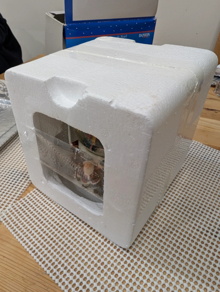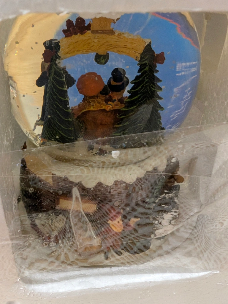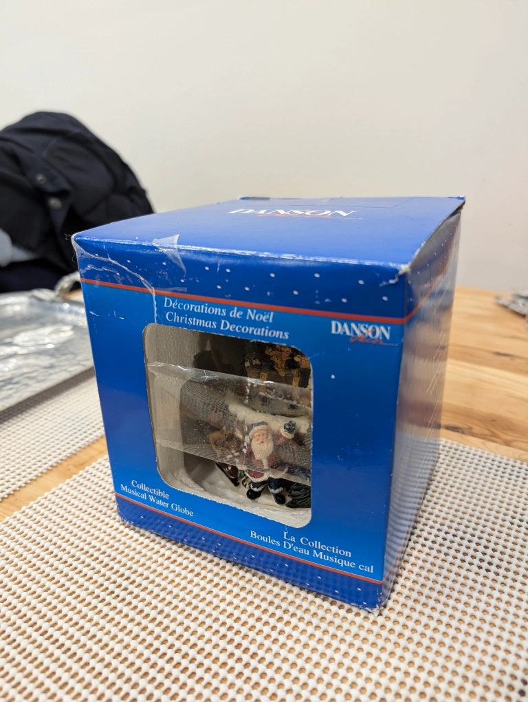 This snow globe features a charming scene of Christmas figures. It is packaged in its original box. Only opened once.