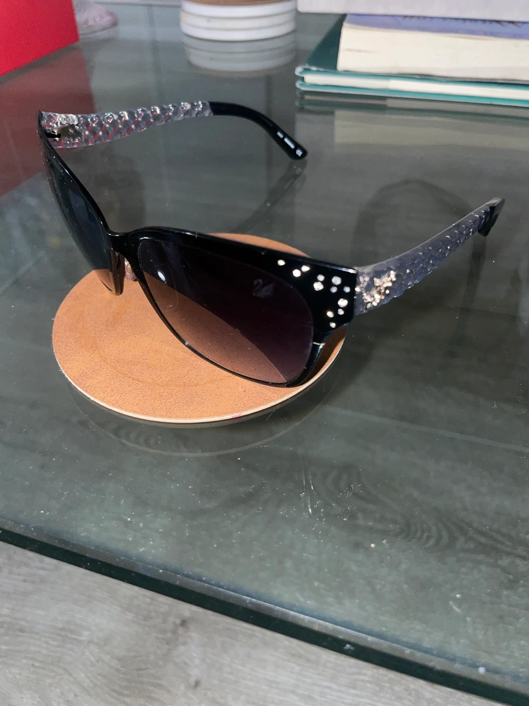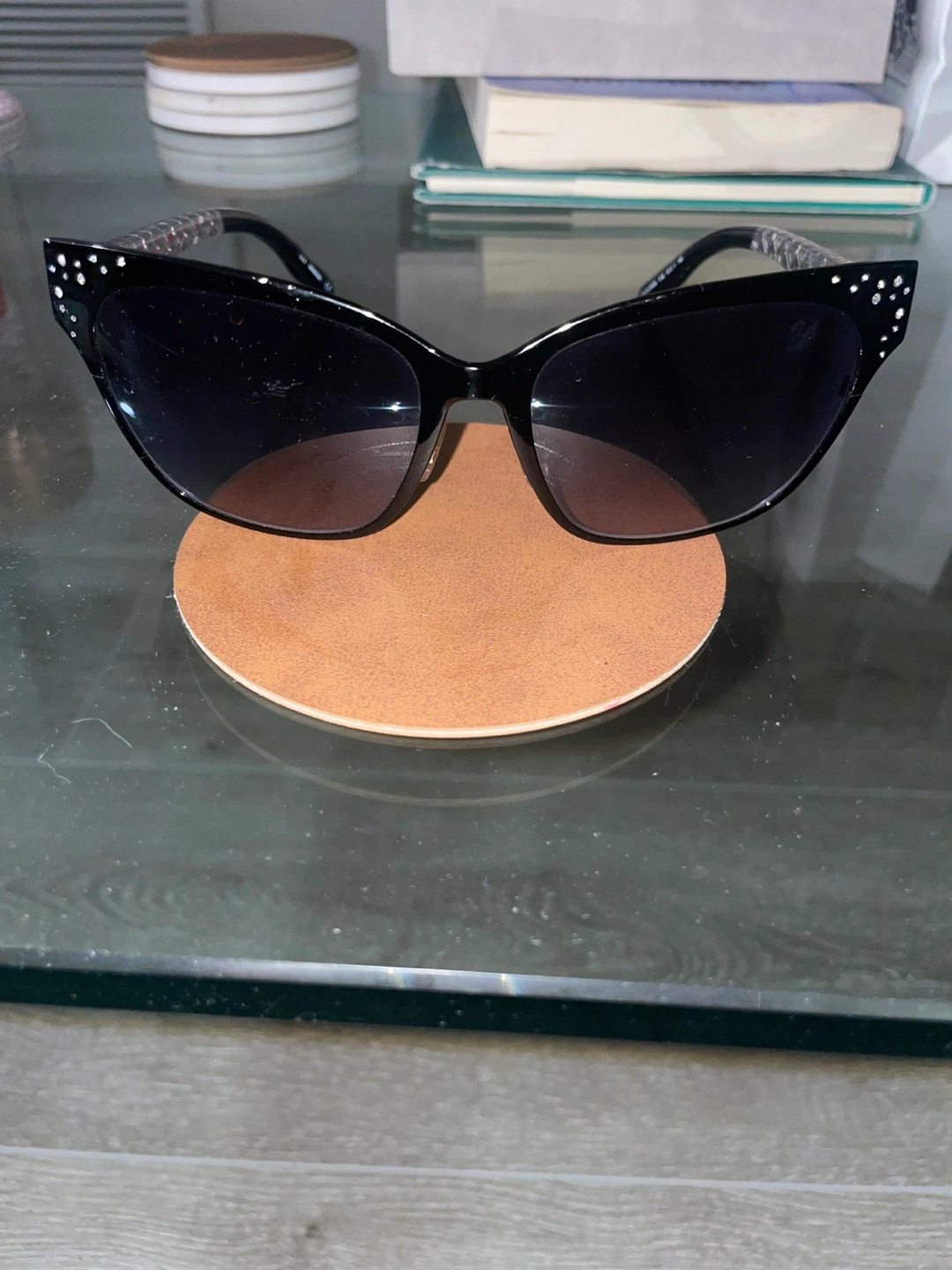 These sunglasses have black frames. Rhinestones are along the frame and the arms.