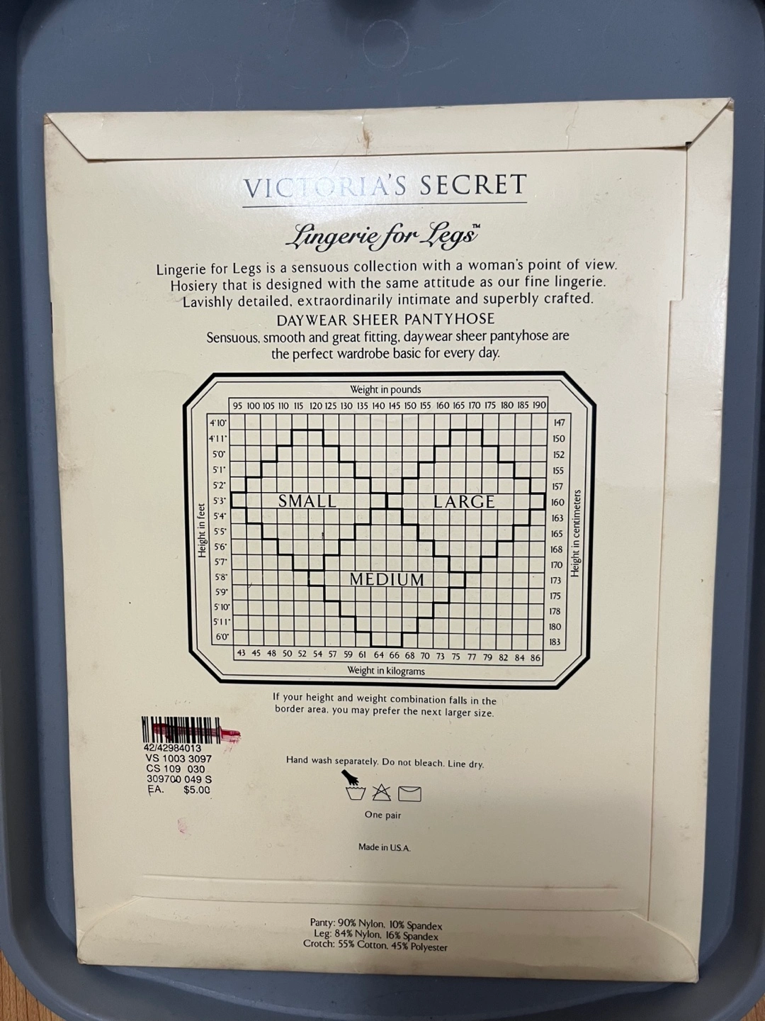 Pantyhose in its original packaging. Includes a sizing chart and washing instructions. These will be a good addition to your wardrobe.