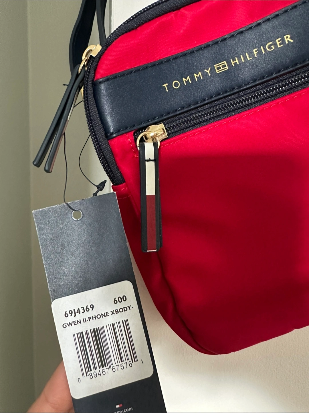 146Red and navy crossbody bag. Featuring a zipper closure, an adjustable strap, and a tag. A stylish bag for a relaxed outing.