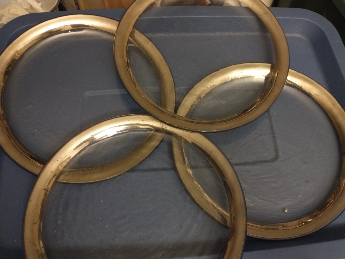 FOUR GOLD RIMMED CLEAR GLASS DINNER PLATES. I THINK THESE ARE HANDMADE AS THERE ARE RIPPLES IN THE GLASS. THESE HAVE BEEN USED, SO SOME OF THE GOLD ON THE RIMS IS SCRATCHED IN PLACES, HOWEVER THIS DOES NOT TAKE AWAY FROM THE BEAUTY OF THE PLATES. NO CHIPS, OR CRACKS. RECOMMEND HAND WASH ONLY.