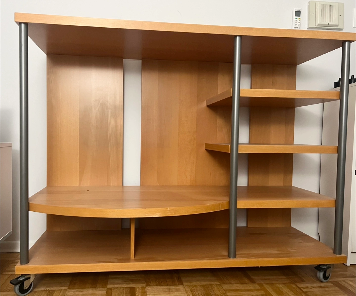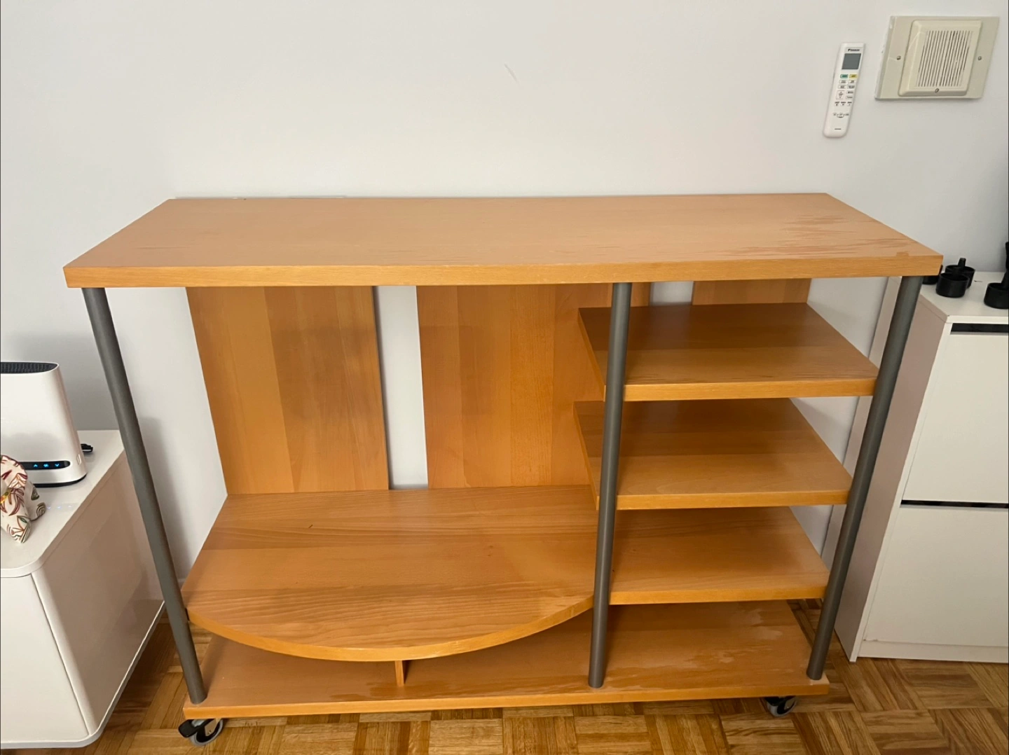 I'm selling a wooden media centre. Features a central open storage space. Side shelving with a curved shelf. Set on rolling casters. I think this would make a great addition to your relaxing space, it’s in a very good condition, barely use it for couple of months but need get ride off it since I moved to a new house smaller than before .