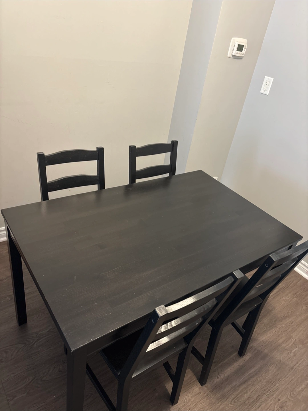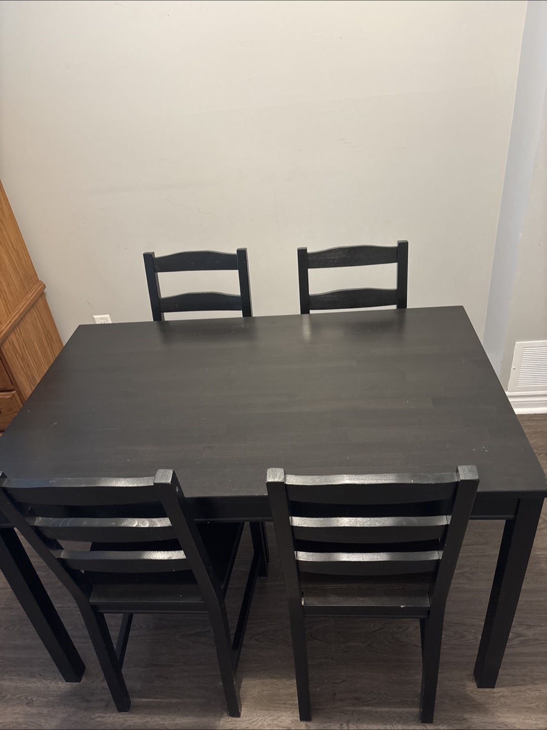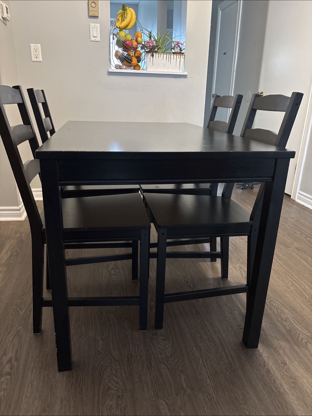 Dining set with a black finish. Includes a table and four chairs. Perfect for your next dinner party.