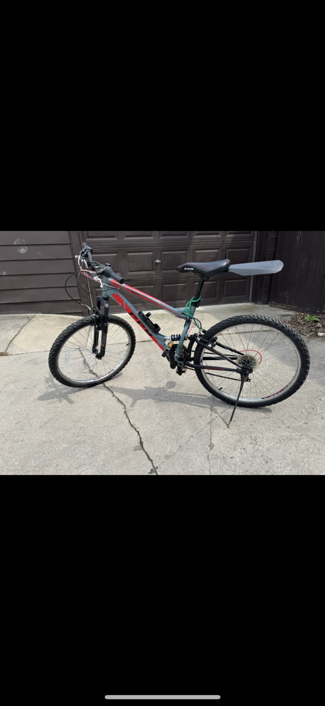 A mountain bike with a black seat, and a red and grey frame. Features two wheels, and hand brakes. I am 5’7 for reference but adjustments can be made