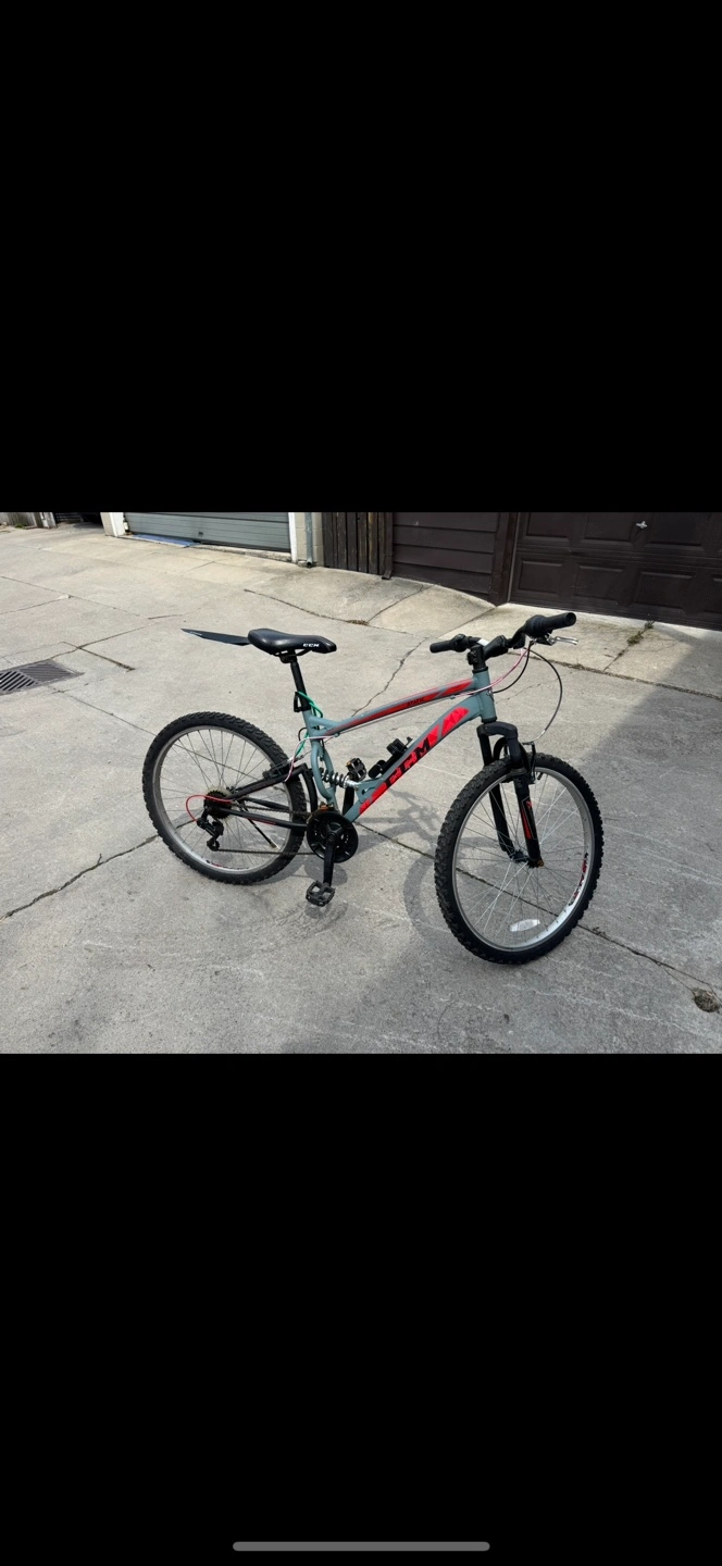 A mountain bike with a black seat, and a red and grey frame. Features two wheels, and hand brakes. I am 5’7 for reference but adjustments can be made