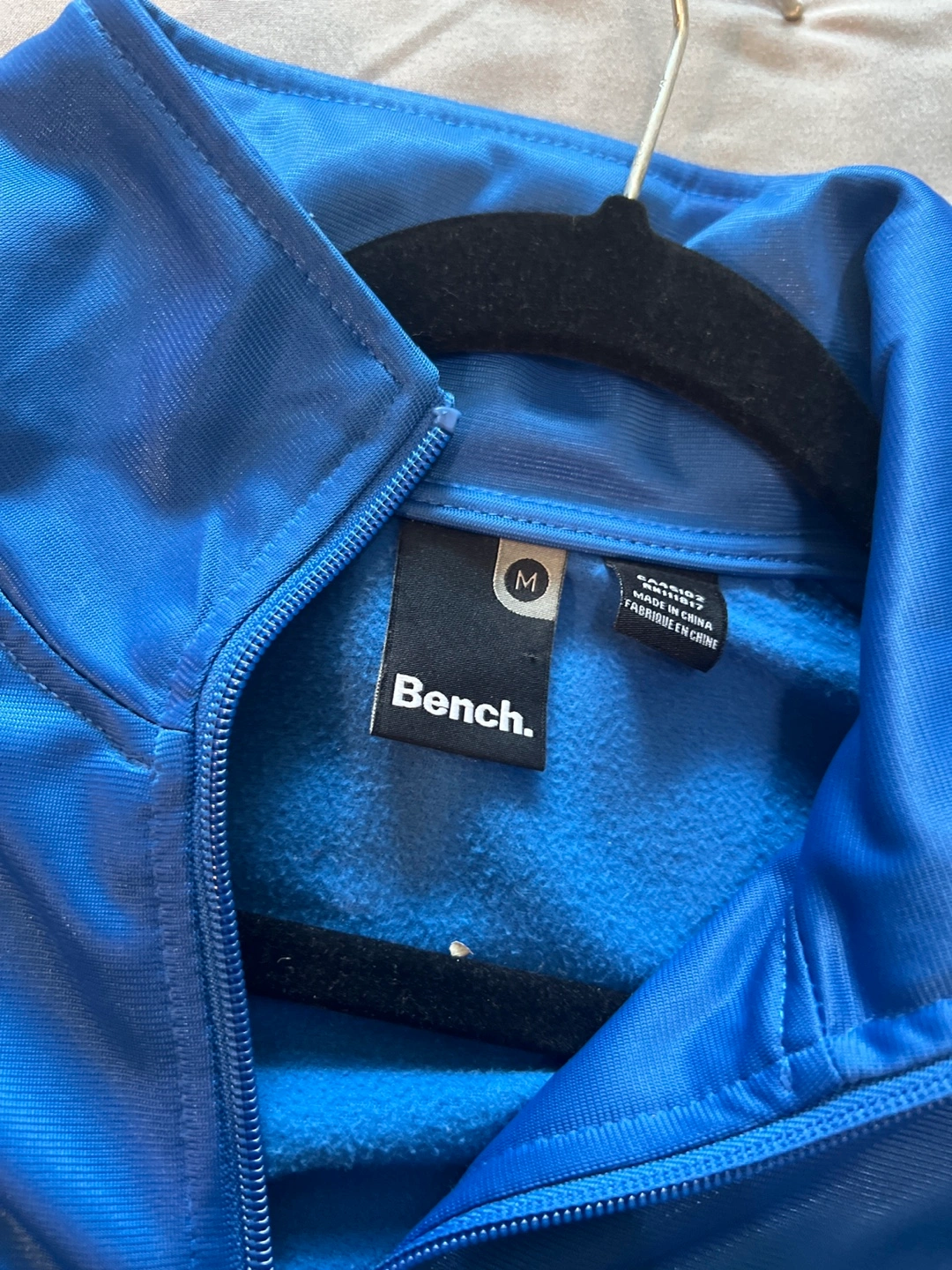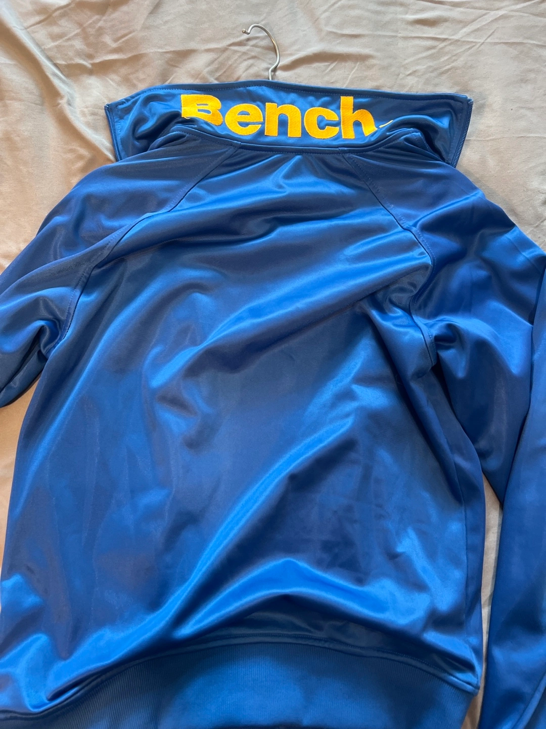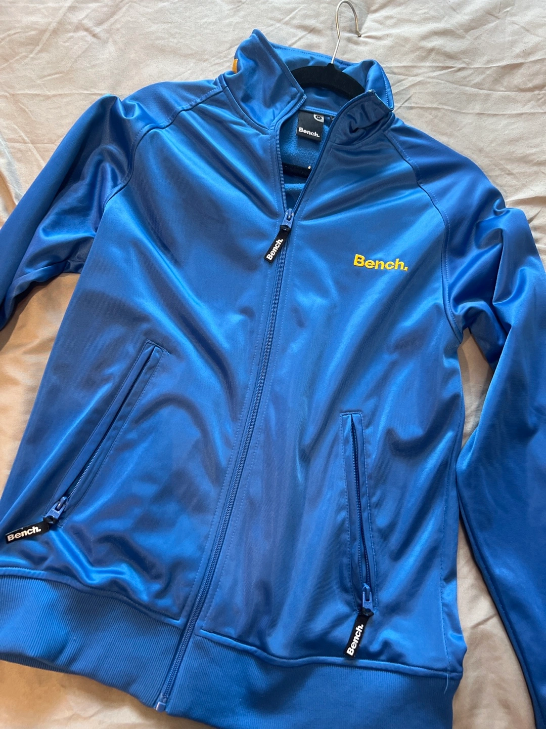 1000+A bright blue track jacket. Has a zipper closure. Features two side pockets. Would be wonderful to wear on a crisp, cool day.