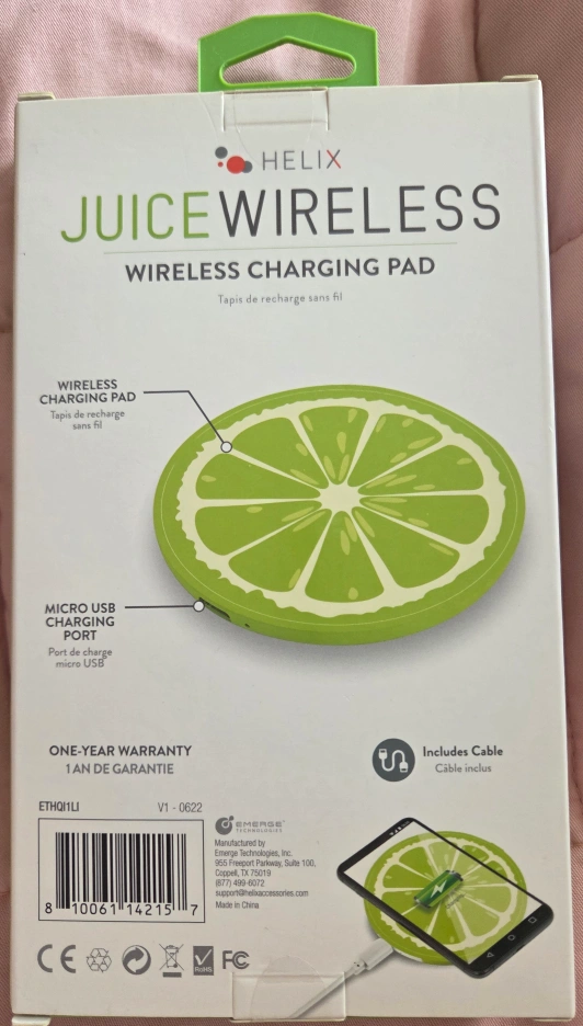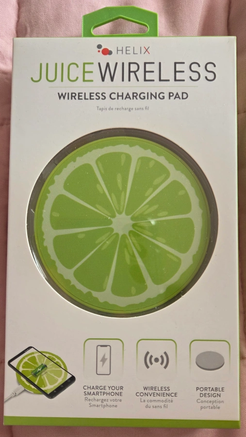BNIB. Never used wireless charging pad, with a lime design. Micro USB port. You can place this item on your nightstand to charge your phone while you sleep peacefully. Also including free wireless car charger (no cord)