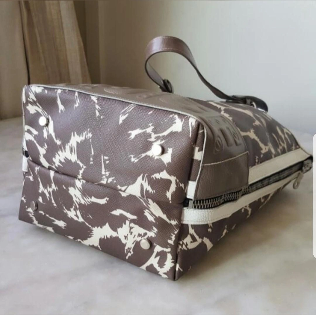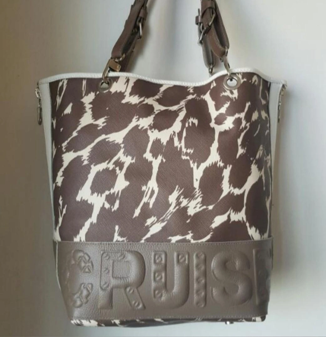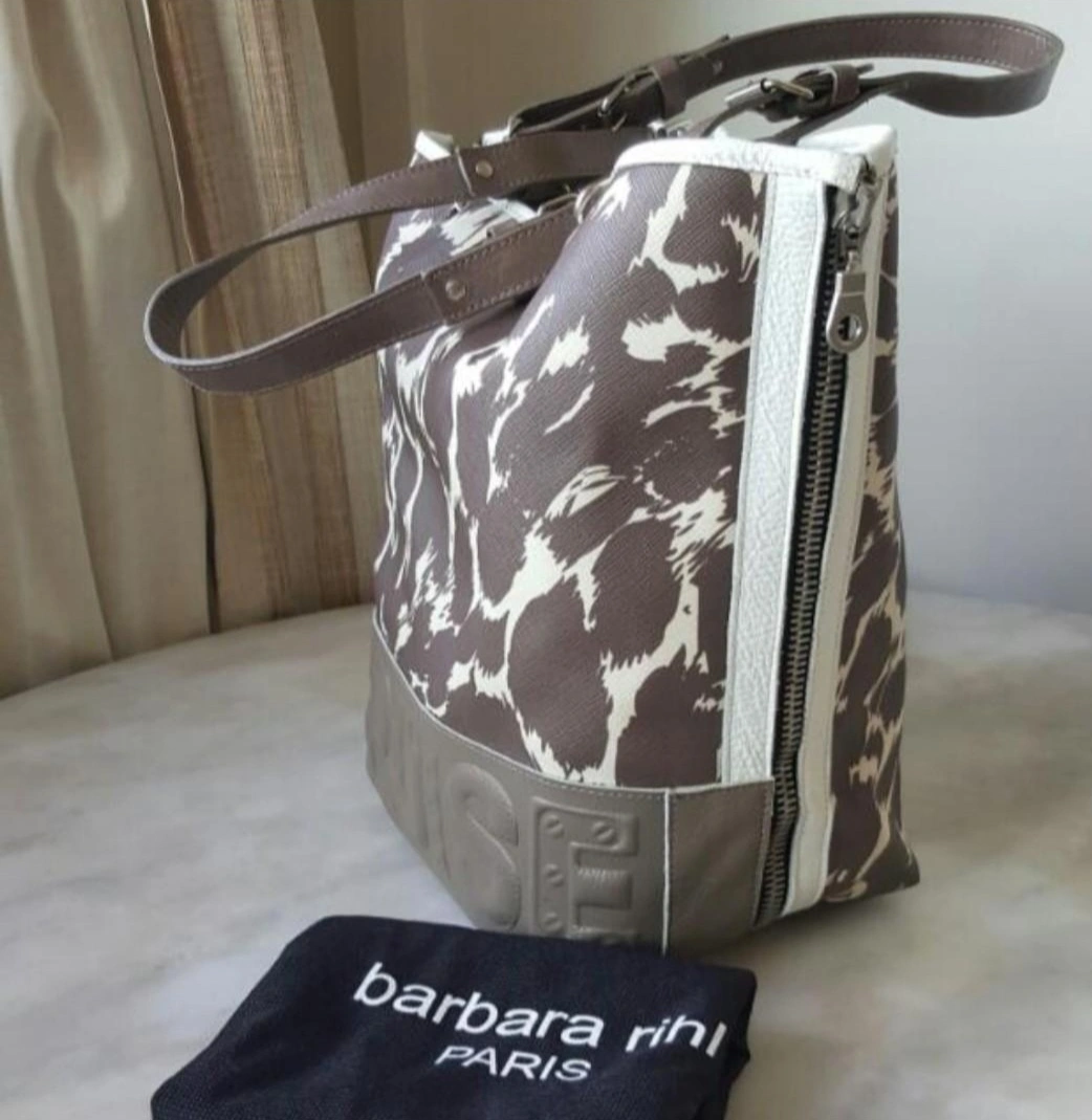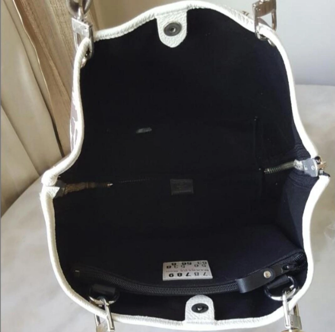Very beautiful bag with zip opening on both sides. Has a removable pouch/ pocket on the inside. Magnetic snap closure. Leather straps.