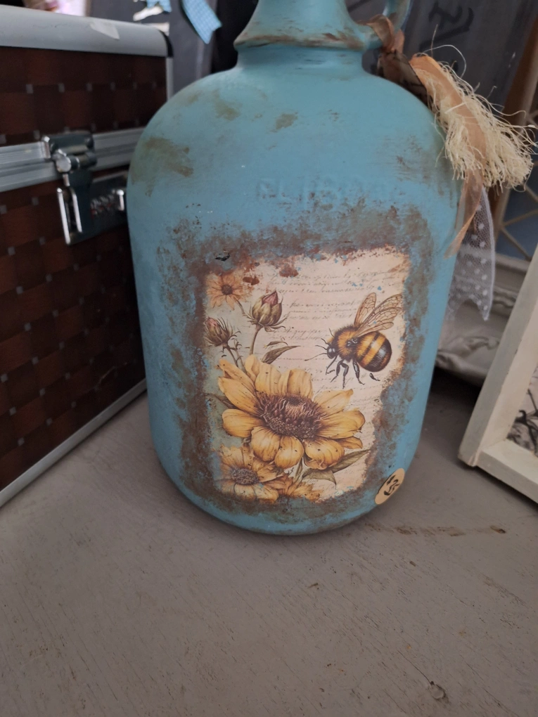 I'm offering a beautiful vintage jug. The jug is painted with a blue finish. Also decorated with a flower and bee image. It has decorative ribbons, on the handle. It would be a great piece to add to your favourite space. approx. 12 inches tall with a 6 inch diameter base.