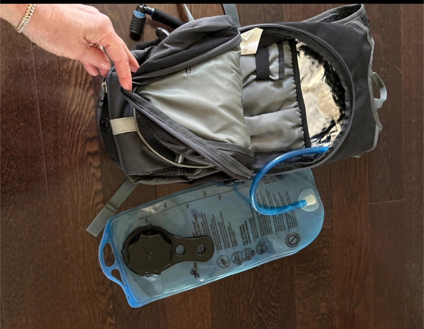 Small hydration pack, grey and black. Includes hydration bladder. Great for running or cycling.
