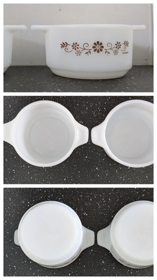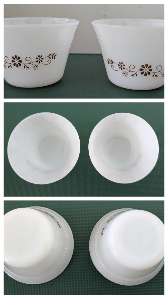 2612 milk glass small soup bowls with brown flowers 2 milk glass dessert cups with brown flowers