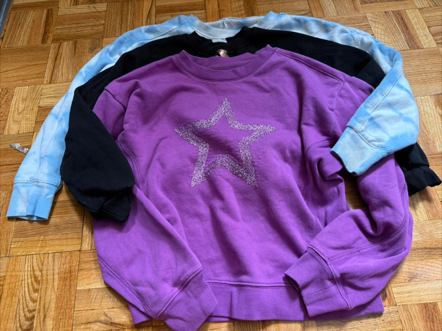 Branded Three assorted sweatshirts. Each one is a different colour. One purple sweatshirt has a star detail. These are great for a relaxing day at home, or out on the go. Check the pictures for sizes.