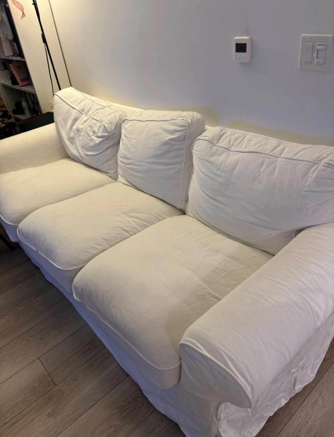 Three-seater sofa. White slipcover. Good condition. Some minor wear. Measurements available upon request.