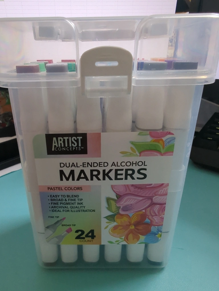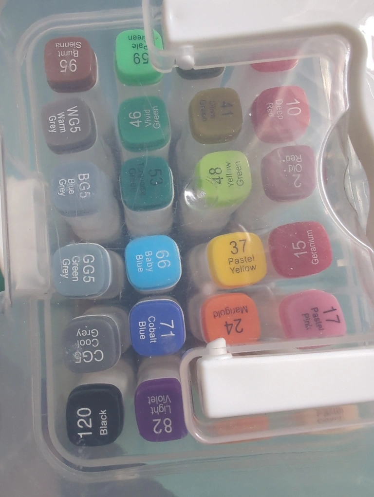 Markers in a clear plastic container. Dual-ended alcohol markers. Pastel colours. A great tool to unleash your creative side and find peace in every stroke. Brought it from Winners but no longer want it