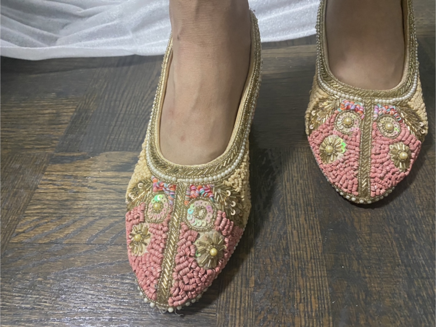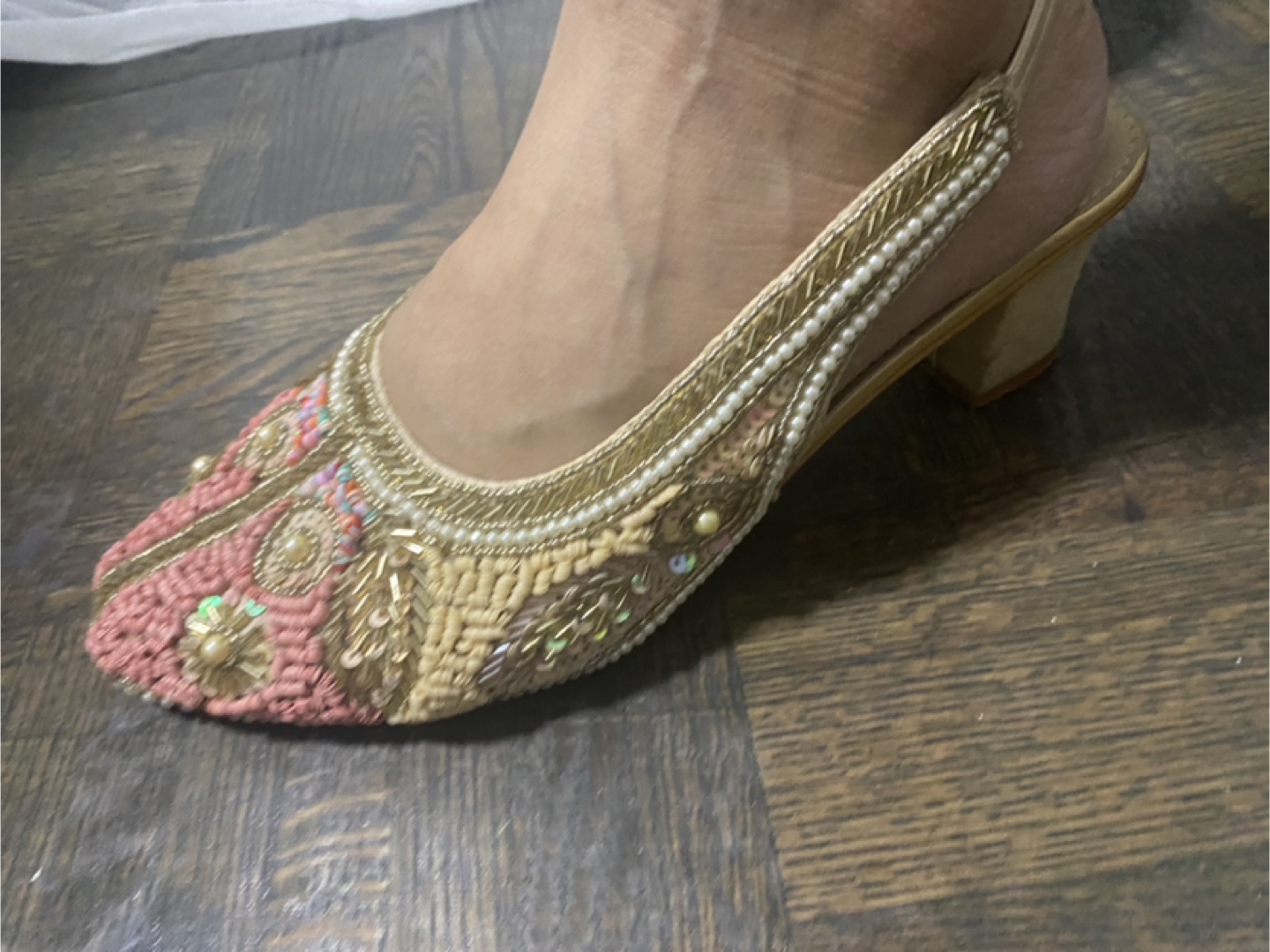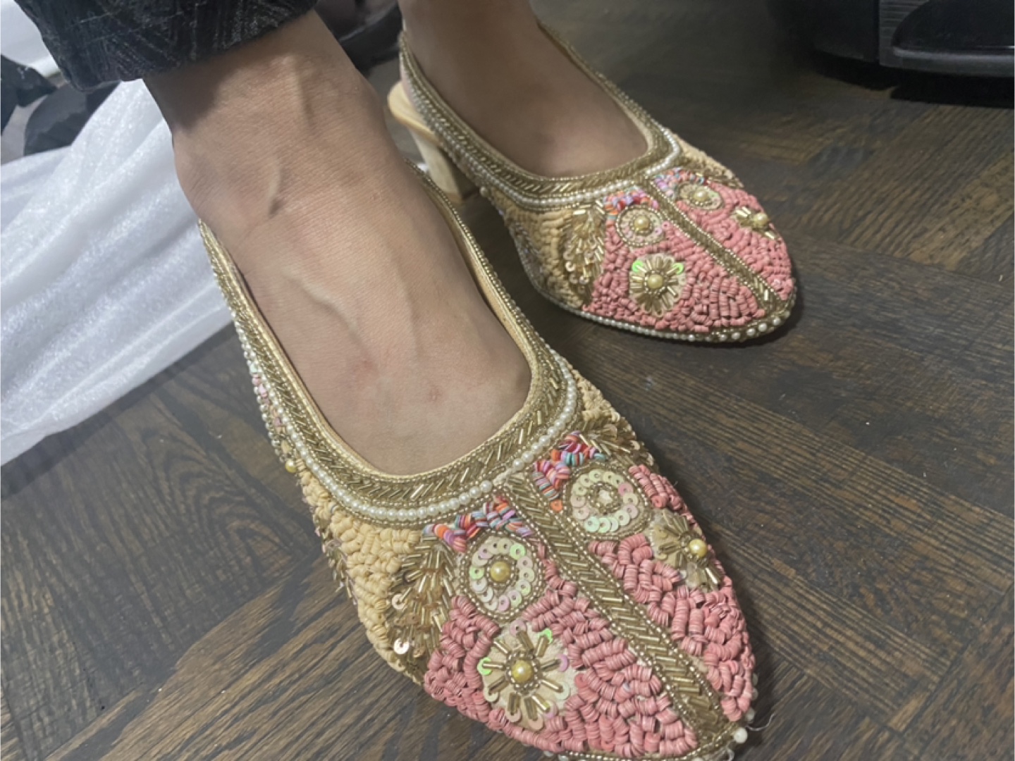 Beautiful slingback heels. Feature intricate embroidery and embellishments. Pearl and sequin details. You will find these shoes are perfect for special occasions and celebrations.