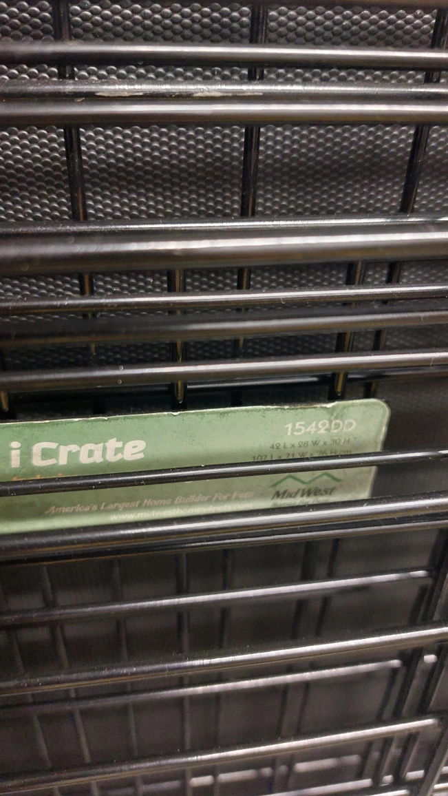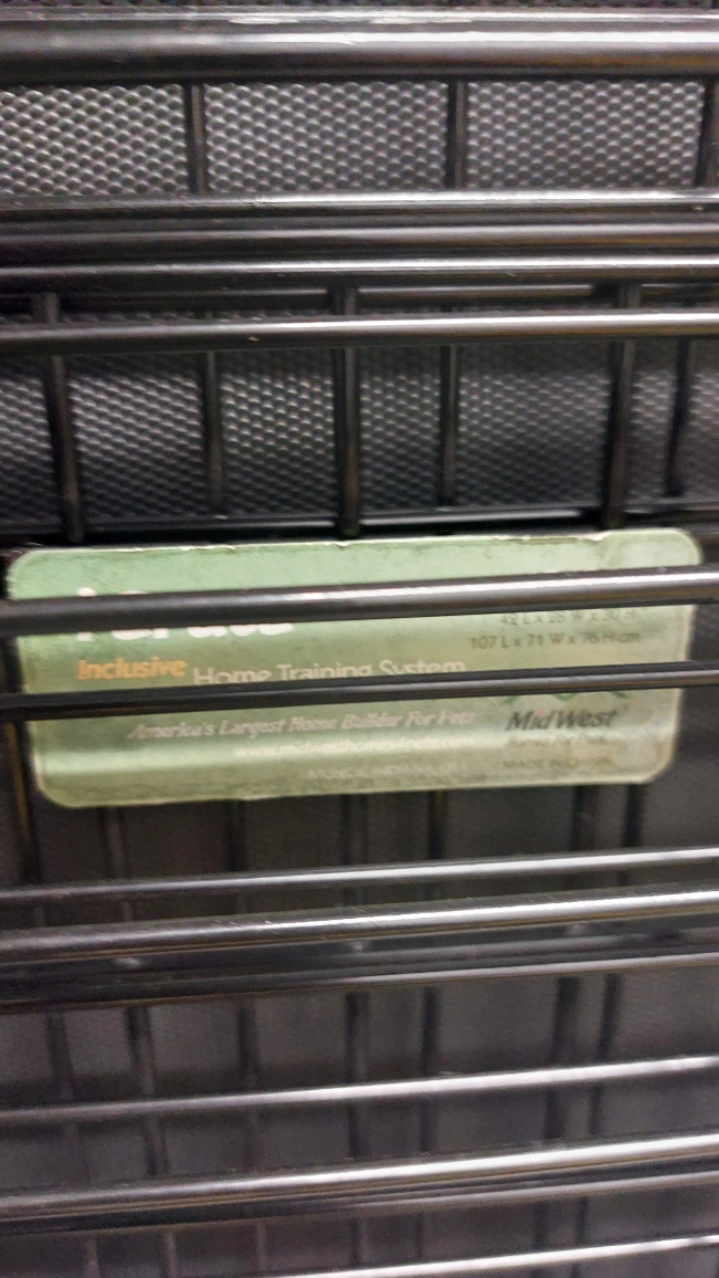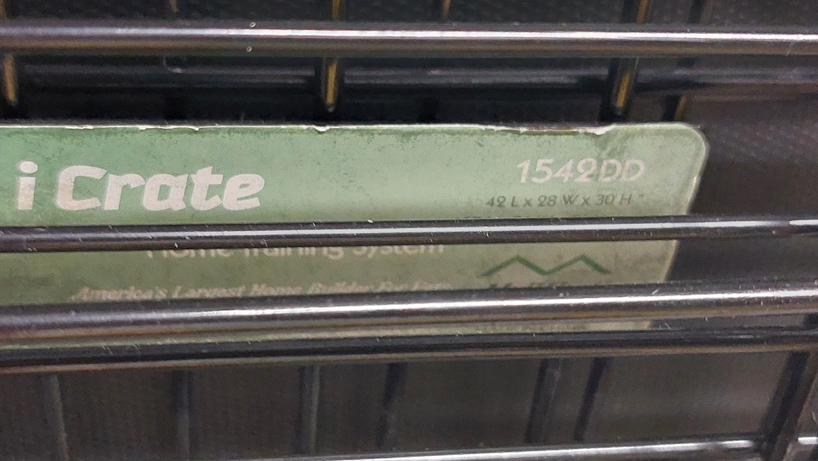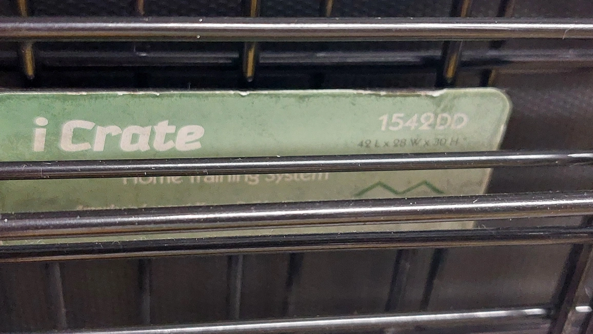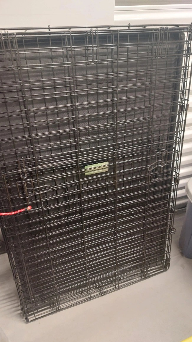 Dog crate for large dogs. Dimensions: 42 (Length) × 28 (Width) × 30 (Height) black wire dog crate. Made from metal wire with a dark interior. Great for crate training your pet, creating a safe space for them