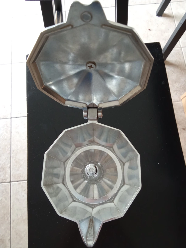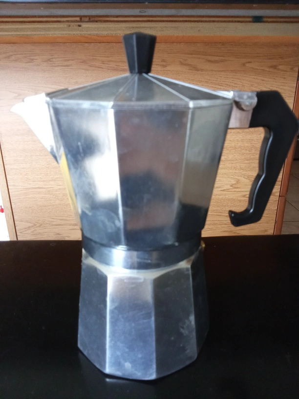 A classic stovetop coffee maker. Made of aluminum. Handle is black plastic. A great way to unwind and make a delicious brew for yourself.