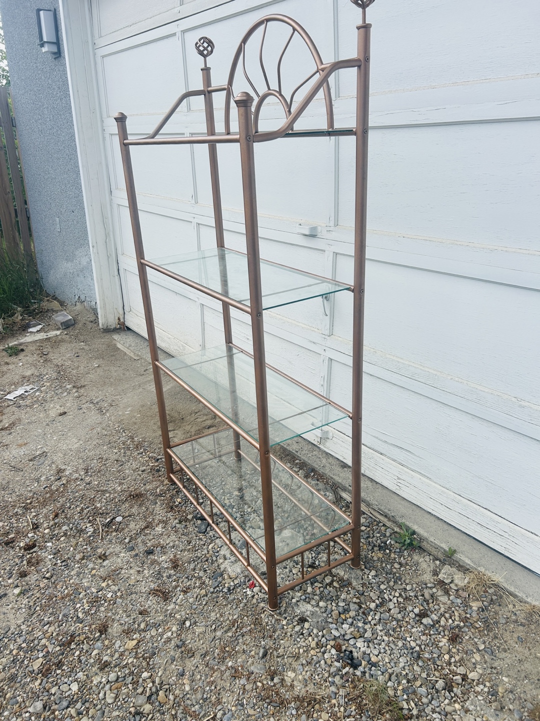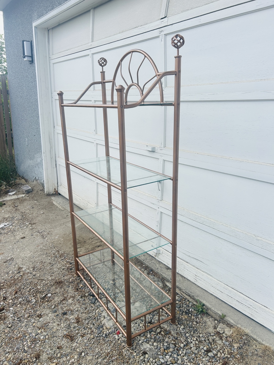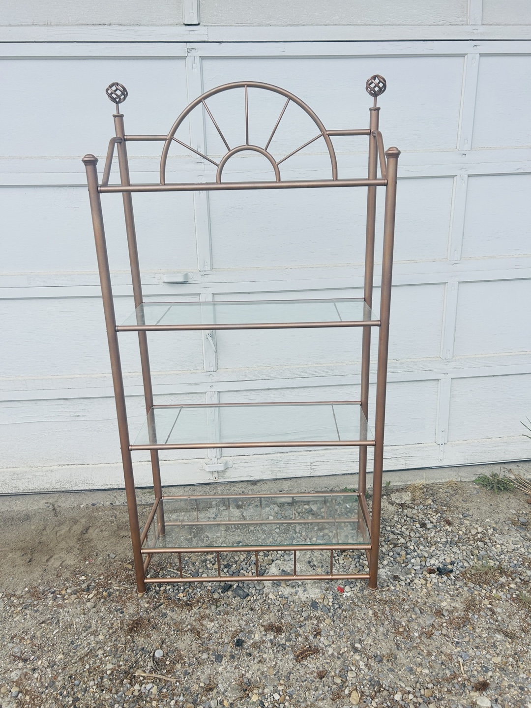 Lovely shelf unit. Features a bronze metal frame. It has clear glass shelves. Perfect for displaying your favourite decor items; you could organize your collection.