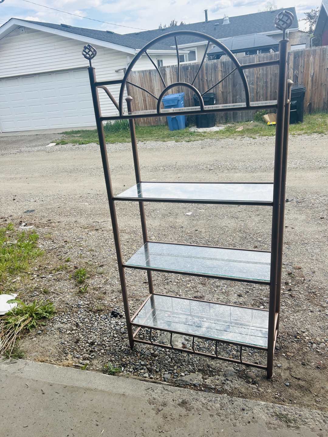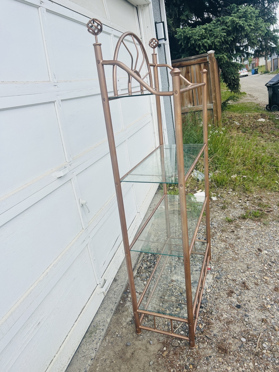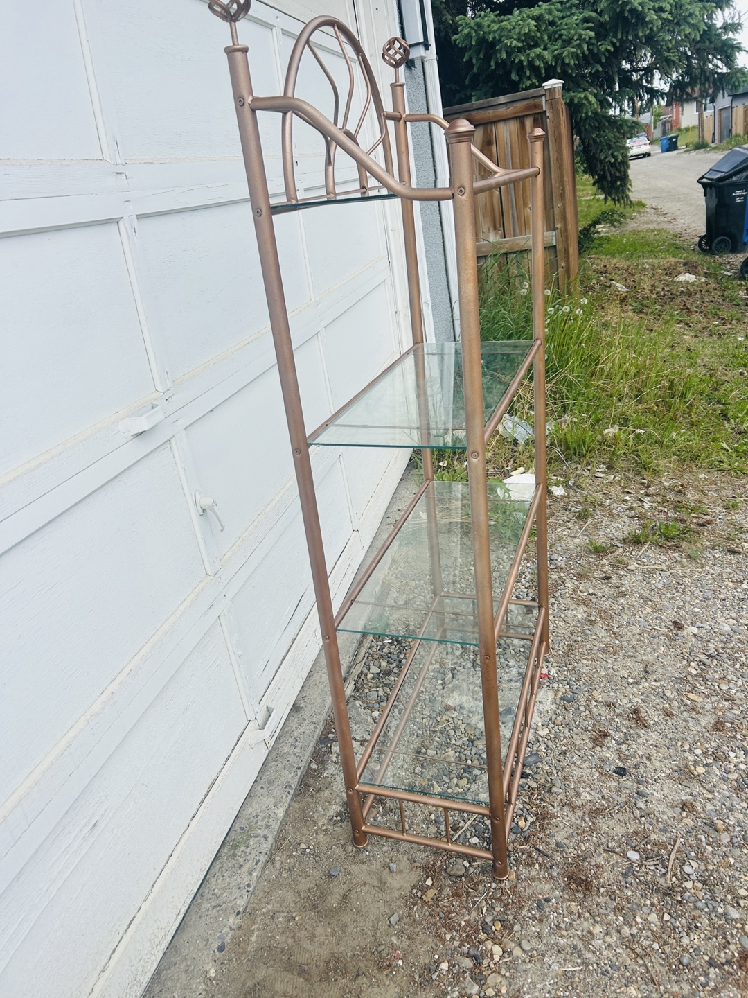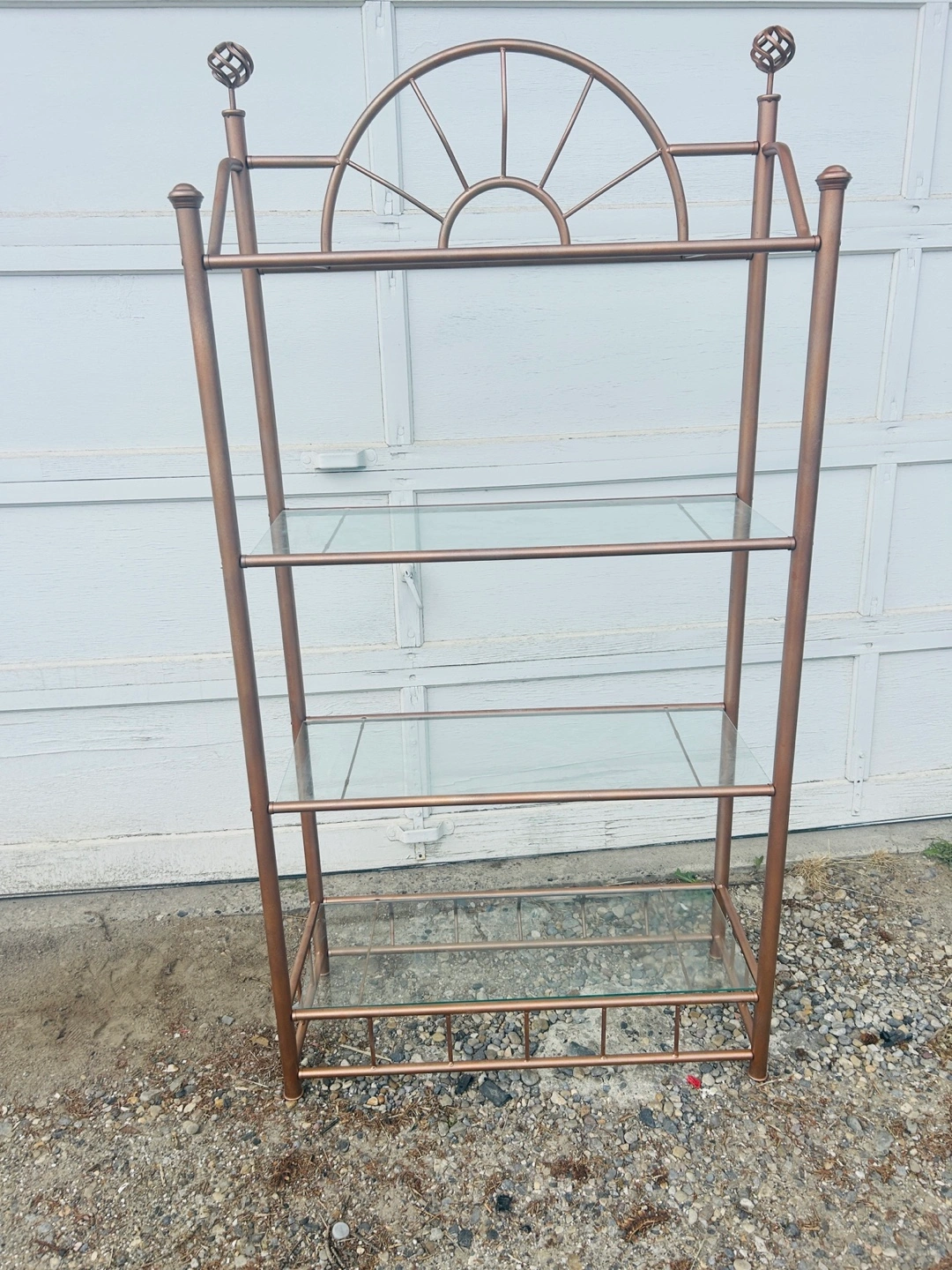 Lovely shelf unit. Features a bronze metal frame. It has clear glass shelves. Perfect for displaying your favourite decor items; you could organize your collection.