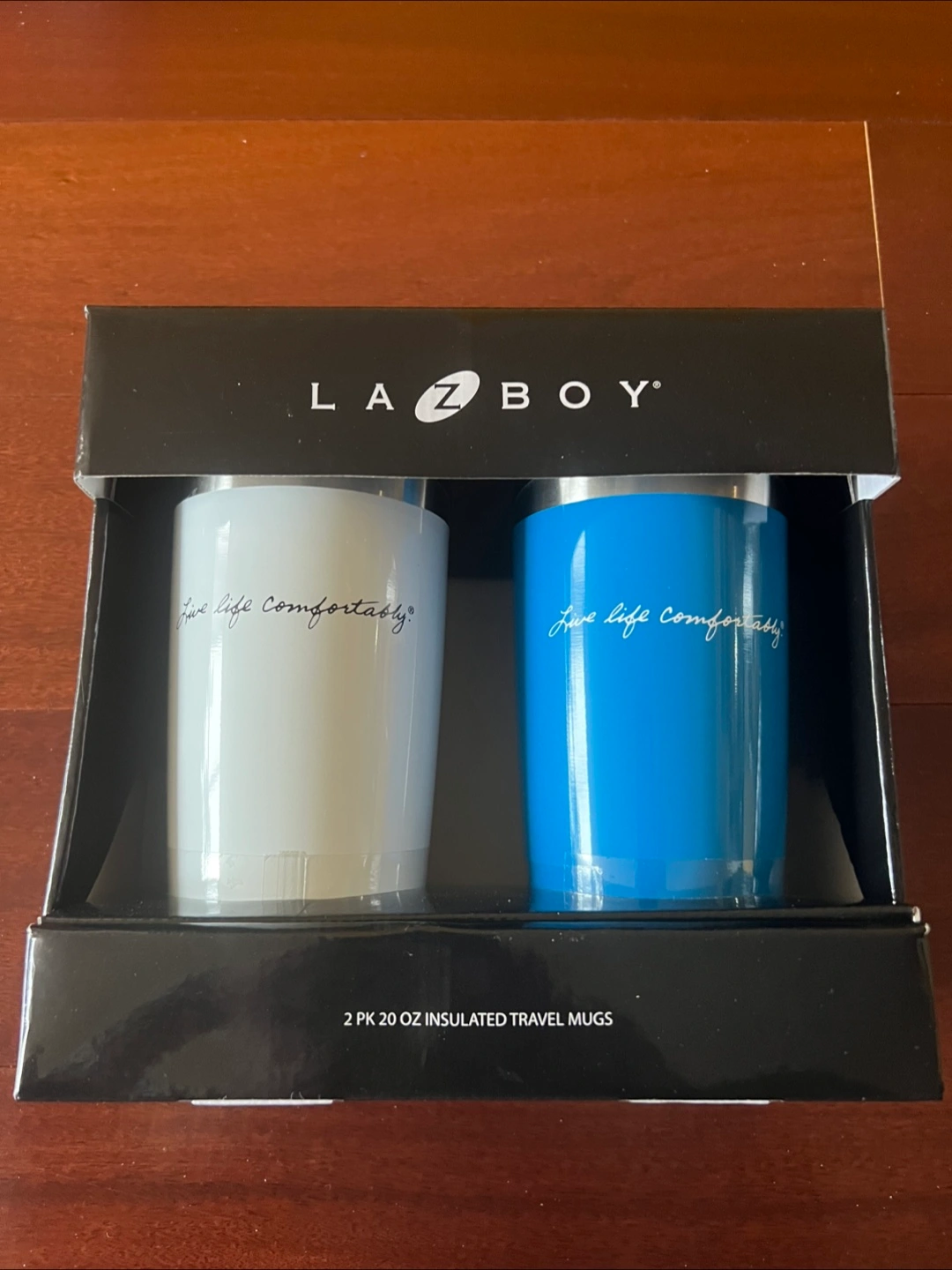 Logo mugs saying “Live Life Comfortably”