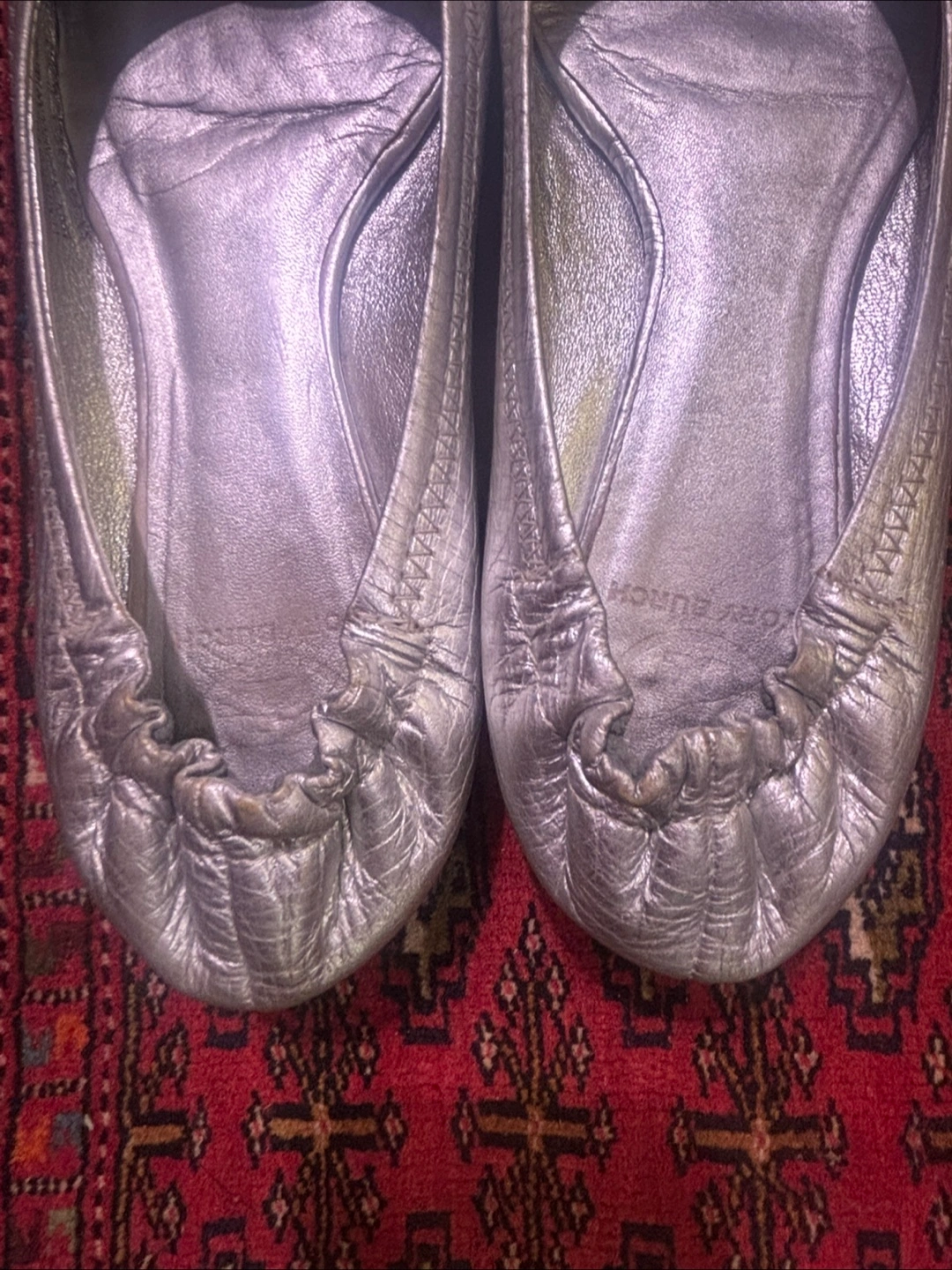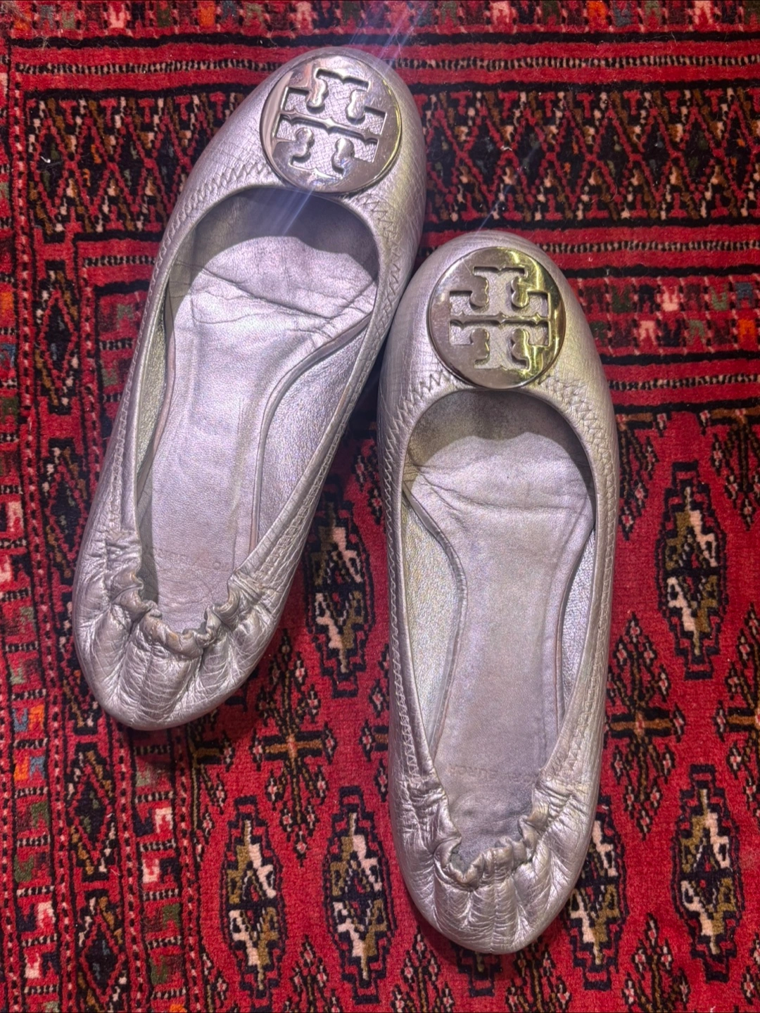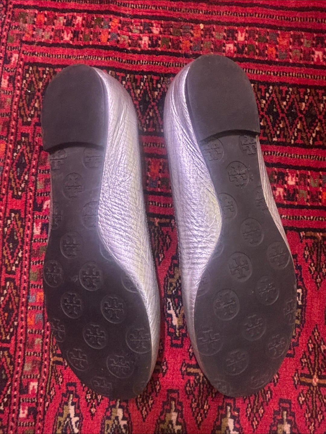 These stylish ballet flats feature a metallic silver finish, a comfortable, rounded toe, and a signature logo. These are great for adding a little touch of elegance to your everyday wardrobe.