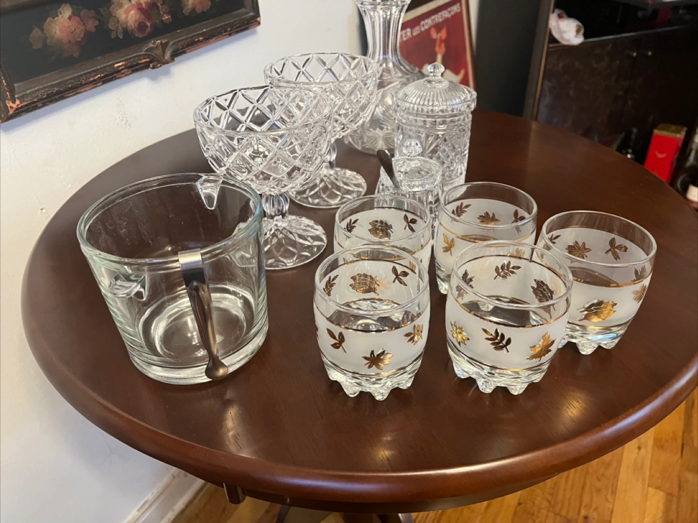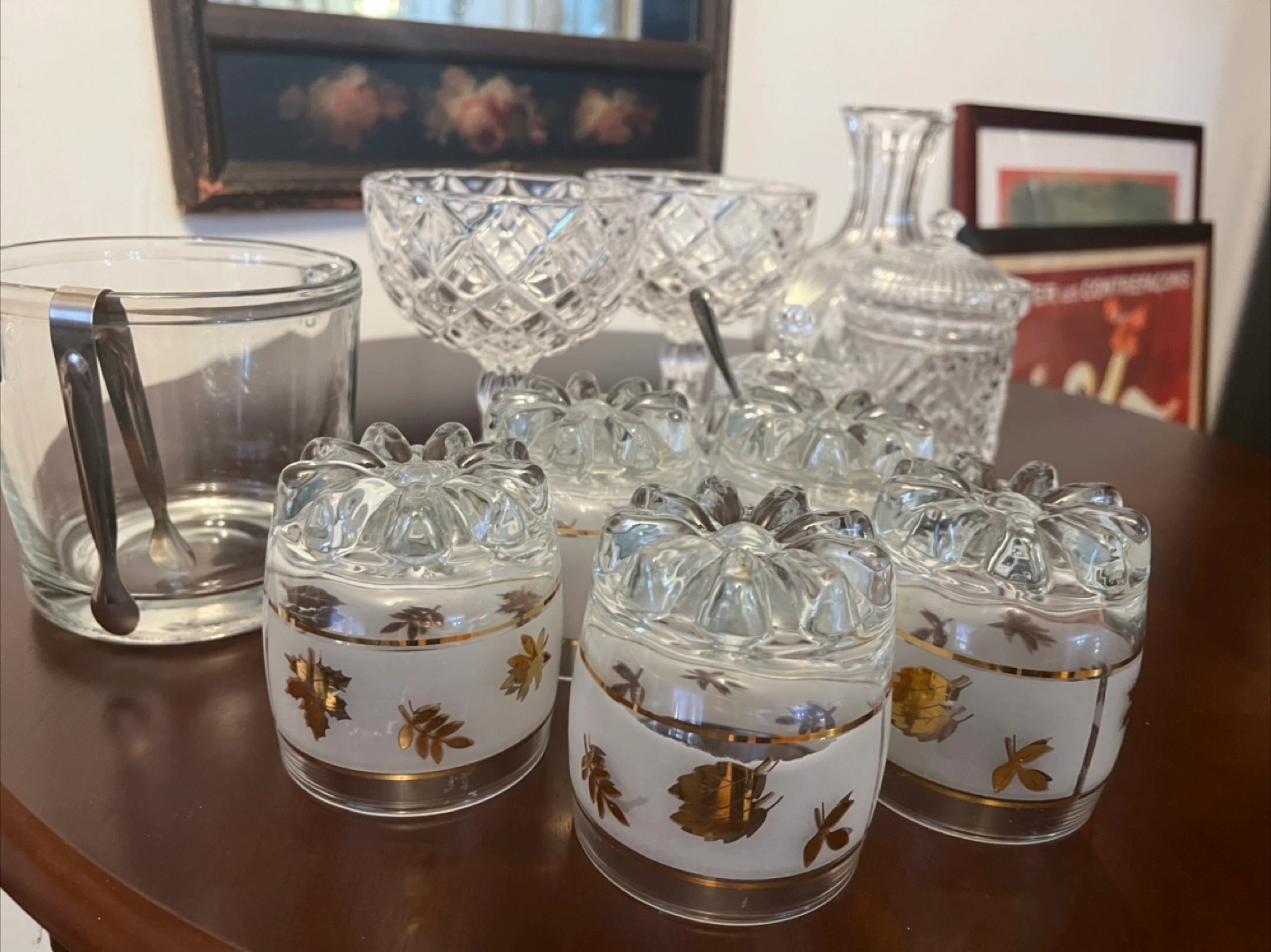 Glassware set with a variety of glasses. Includes multiple pieces with leaf detailing, along with other decorative pieces. This set can be used to serve your favorite drinks in style, offering a touch of elegance to any occasion.