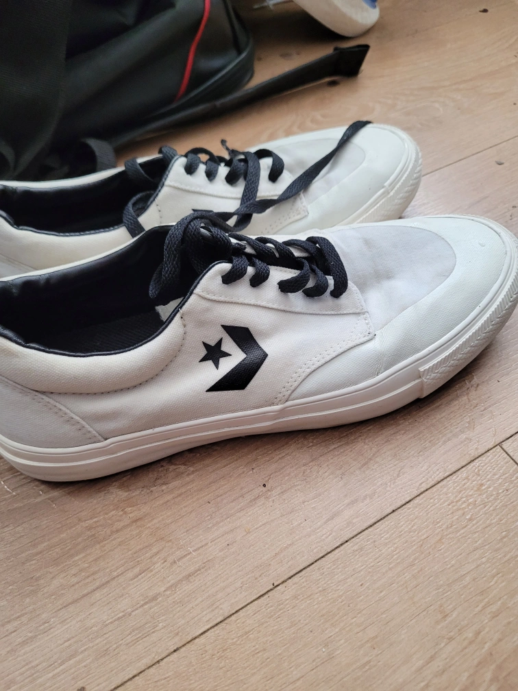 White sneakers with black laces. Features a white rubber sole. The converse logo is visible on the side. These shoes will make you feel relaxed and ready for anything.
