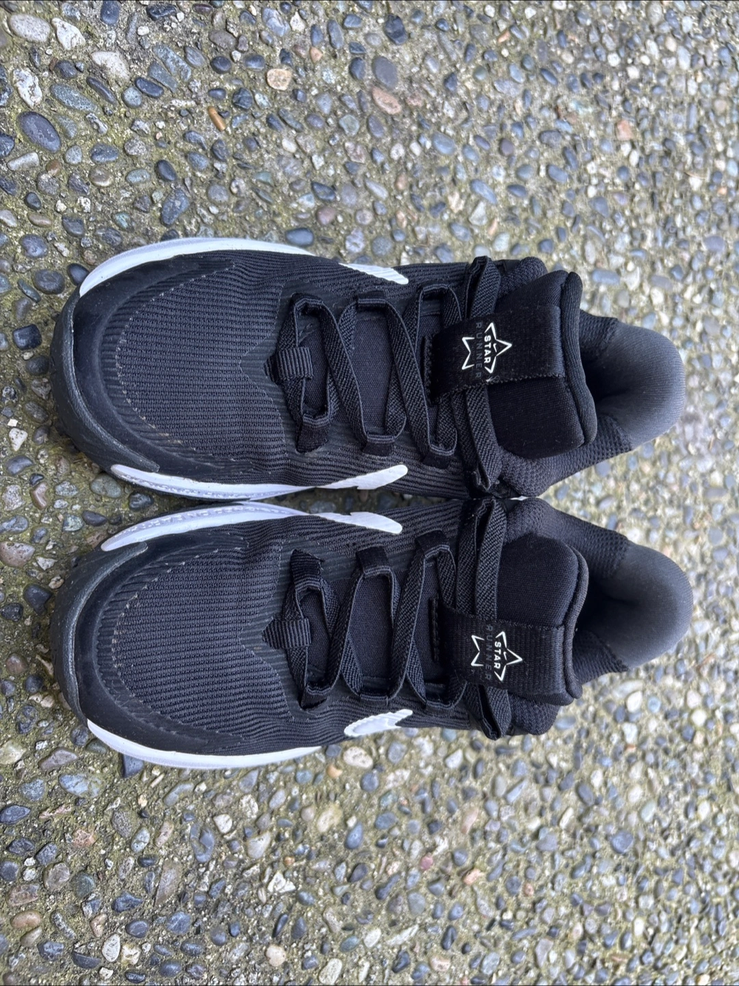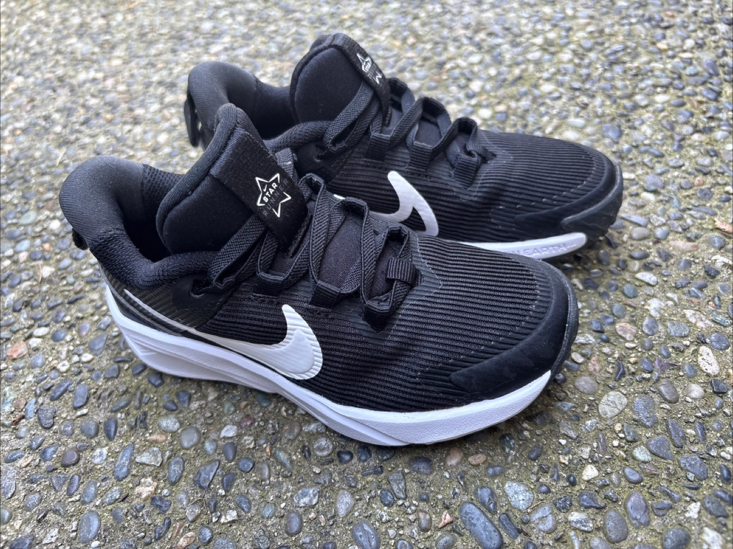 113These sneakers are black with white accents. Features include a white sole, black laces, and a padded collar. They feature the brand logo on the side. These shoes are great for an easy walk through the park.