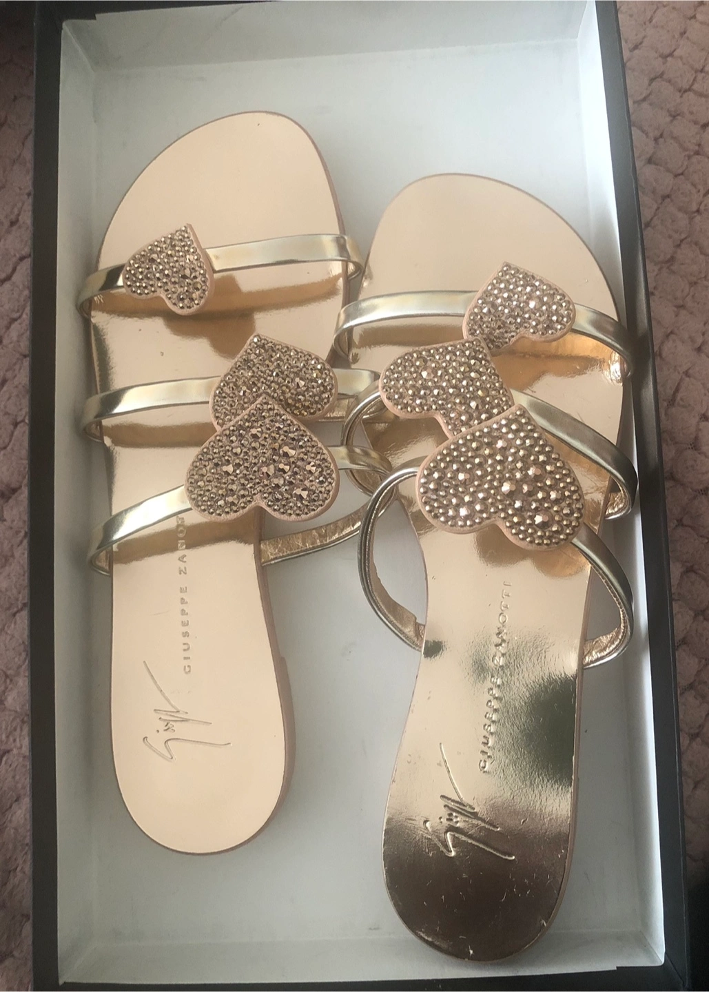 81Giuseppe Zanotti Heart Embellished Women’s Sandal. Rosegold women’s sandal. A lovely item for a hot summer day. Designer slightly worn. Reasonable Price designer. Women’s shoe. Gold women’s shoe. Size 4.5. Size 4.5 women’s shoe. Size 4.5 women’s slide. Women’s designer.