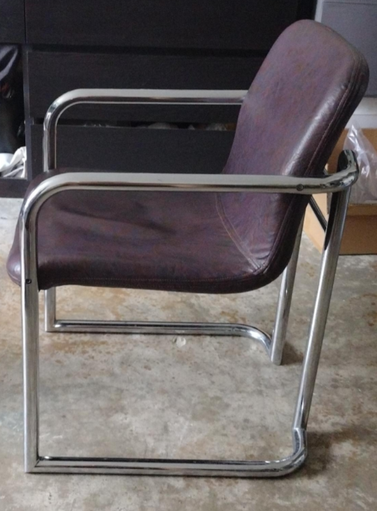 The chair has a dark leather seat and back rest. It has a chrome frame. It would look lovely in a reading nook, where you can relax and enjoy a good book.