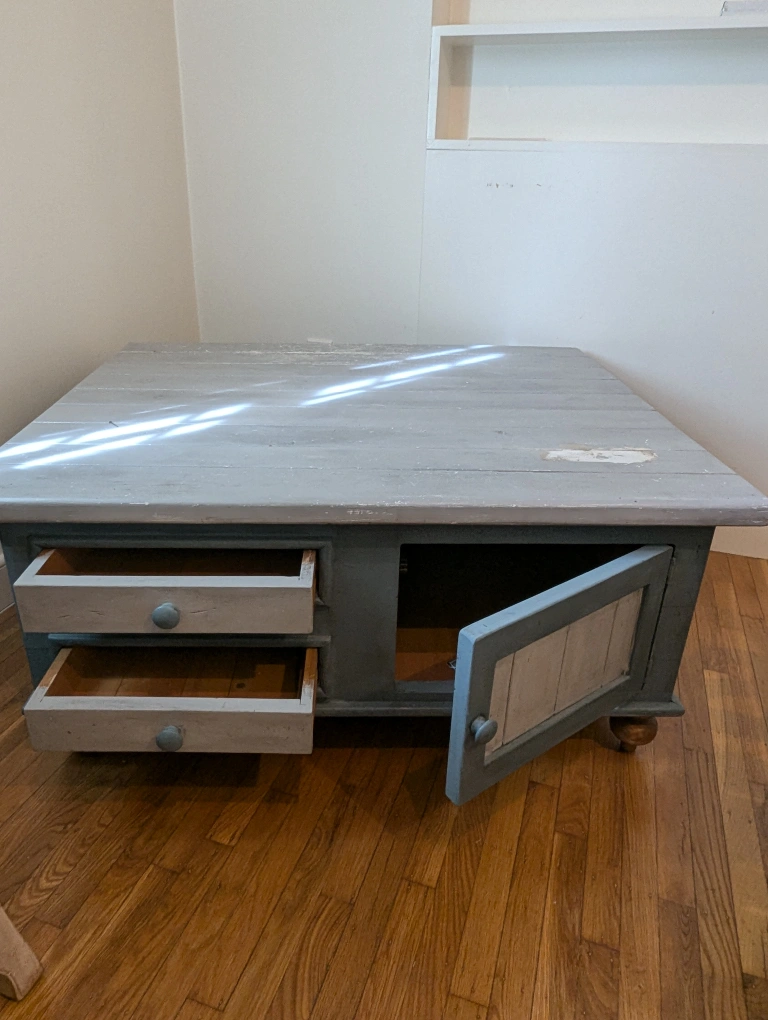 Coffee table painted in grey and teal tones. Features 2 drawers and a cabinet with a door on both sides. This piece will bring serenity to your living space.