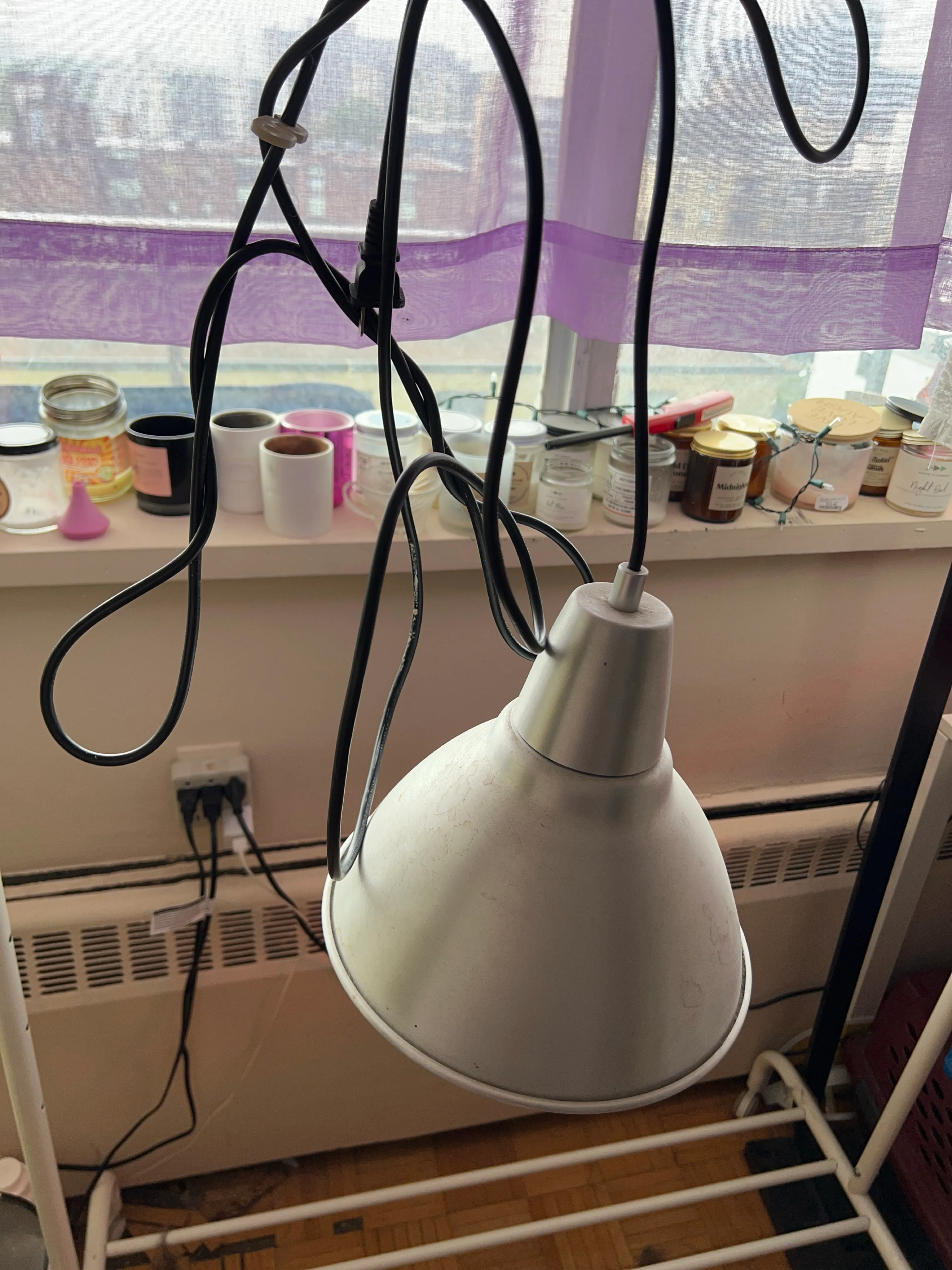 Needs bulb. But handy if you use a hook to create a makeshift hanging lamp